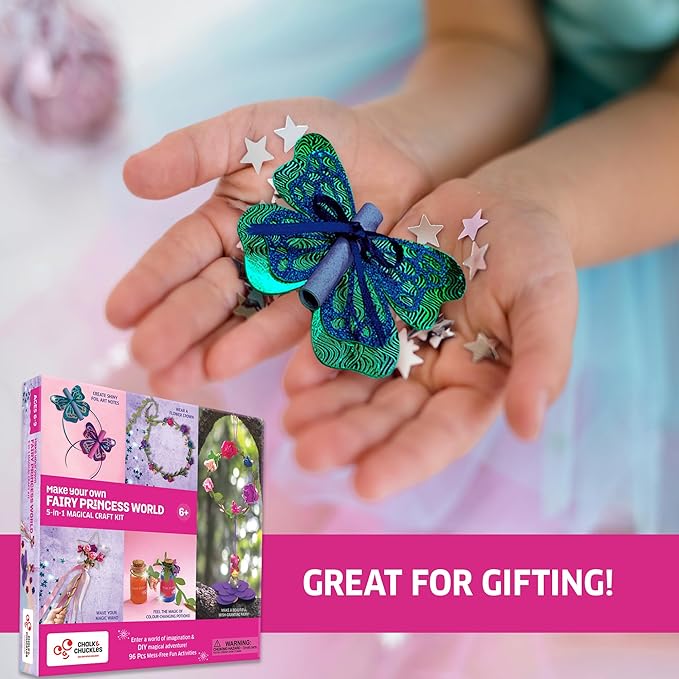 - 9 MAGICAL CRAFT ADVENTURES- Unleash your child's imagination with our craft set. Create 4 butterfly foil art notes, flower crown, star wand, fairy hanging and 2 magic potions