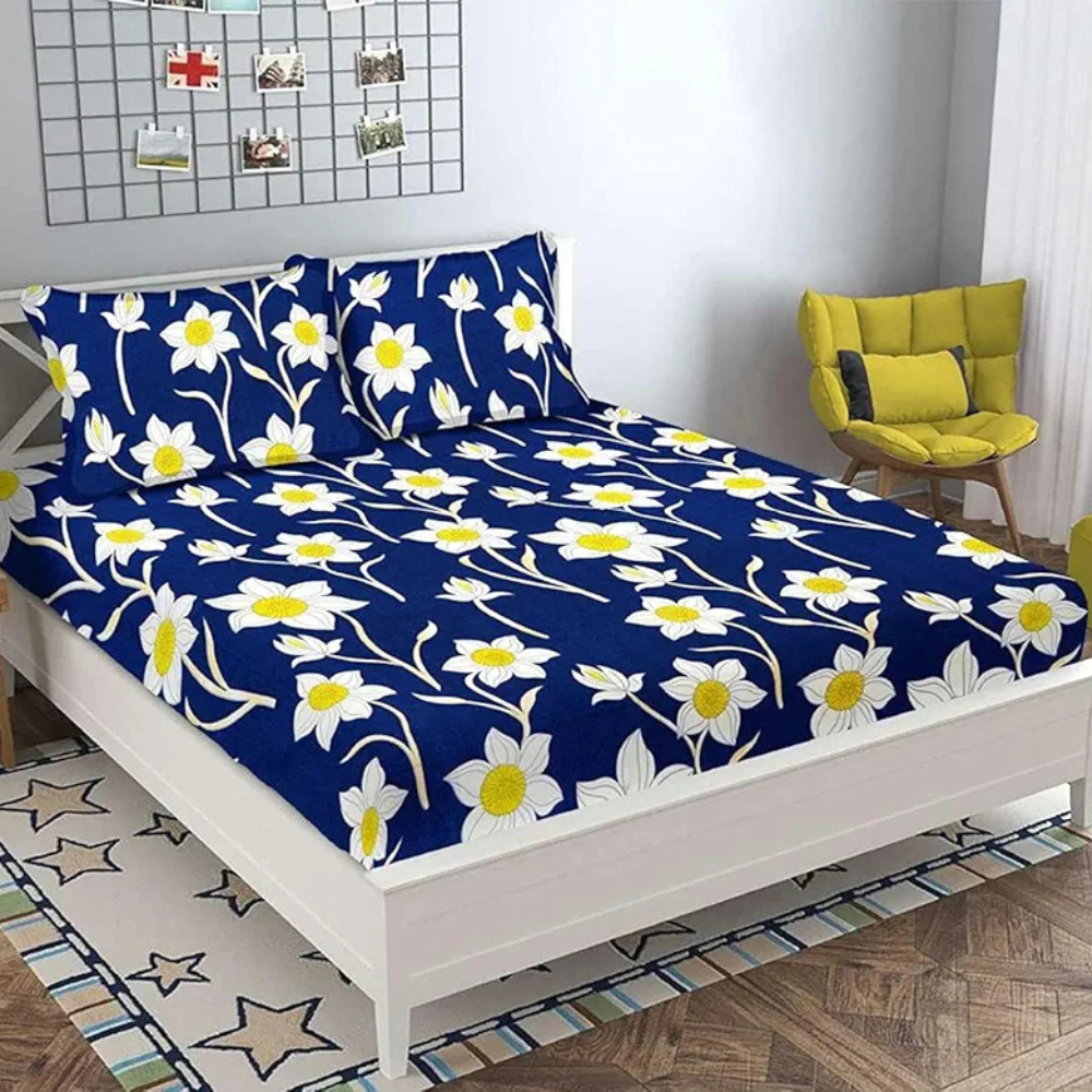 Starnstyle Polycotton 220 TC Floral Printed King Size Double Bedsheet with 2 Pillow Covers Yellow Blue