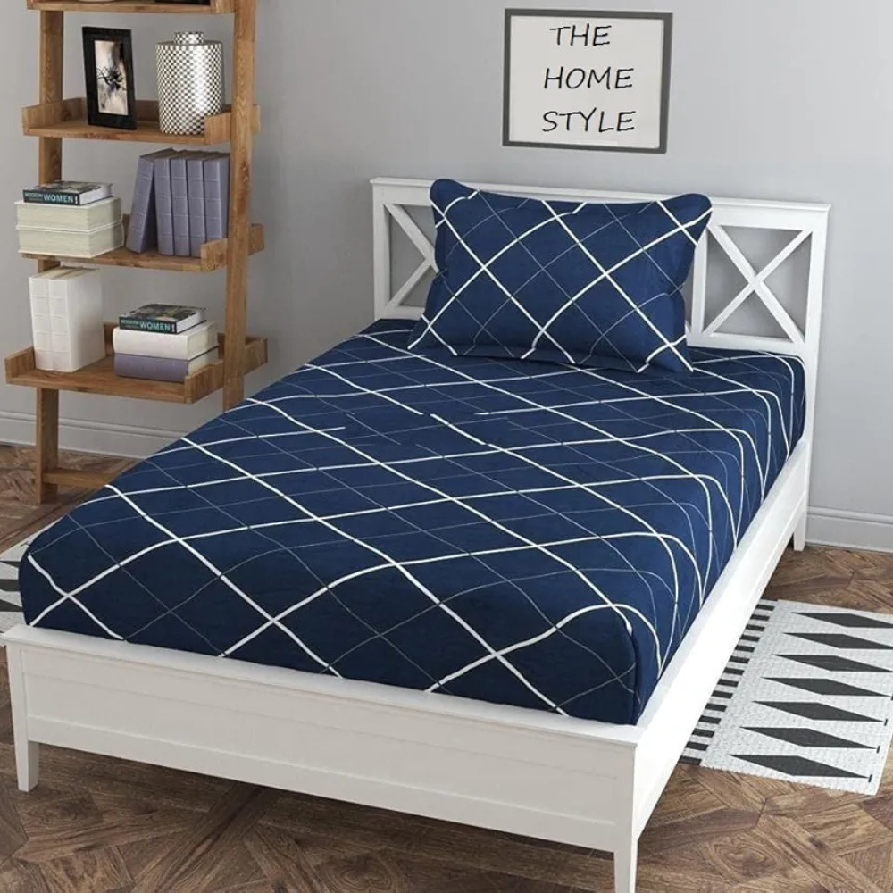 - Material: Glace Cotton ,Color: Navy Blue ,Design: Printed, Type: Elastic Fitted, Size: Single Bed.