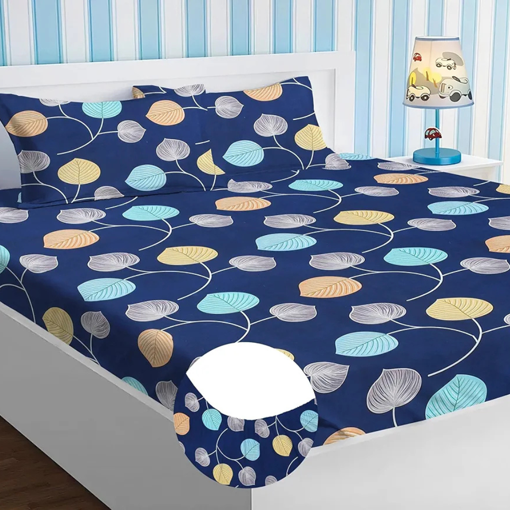 Homekart Premium Cotton Elastic Fitted Bedsheets with 2 King Size Pillow Covers Double Bed Flower Print Dark Blue 200 tc - 220 tc