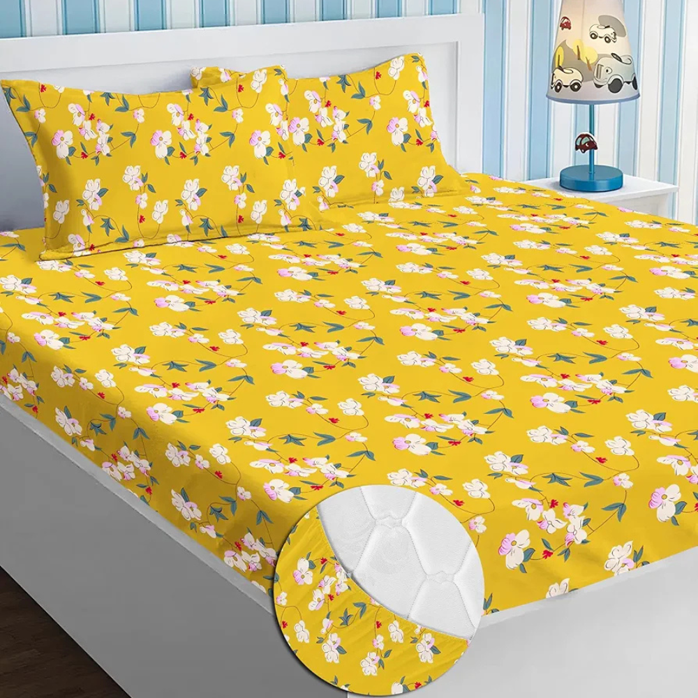 Homekart Premium Cotton Elastic Fitted Bedsheets with 2 King Size Pillow Covers Double Bed Flower Print Yellow and Green 200 tc - 220 tc