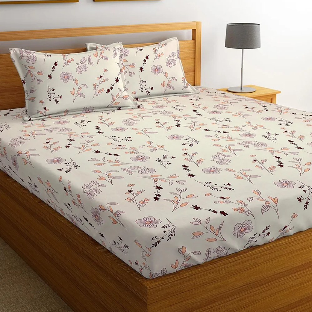 Homekart Premium Cotton Elastic Fitted Bedsheets with 2 King Size Pillow Covers Double Bed Flower Print Color Almonds 220 tc, multicolor