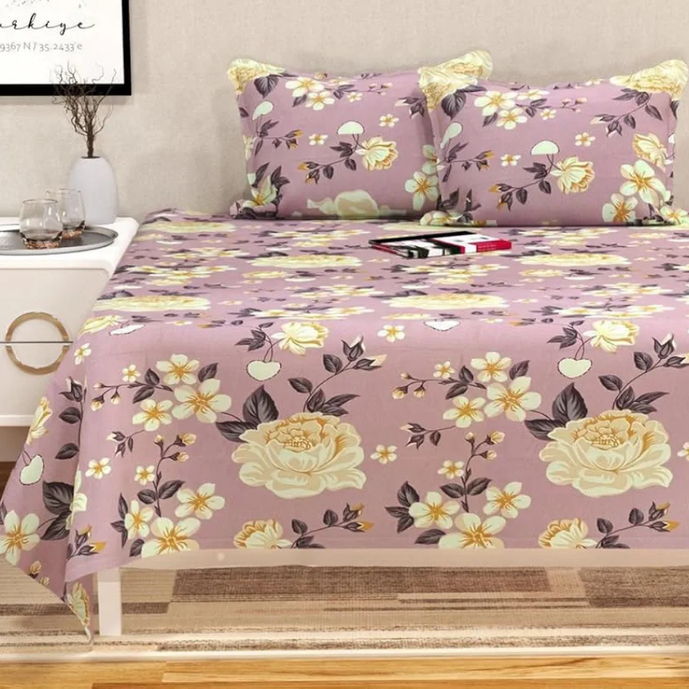 HomeKart Floral Printed Cotton Feel Double Bedsheet with 2 Pillow Covers 200 Tc Soft Premium Printed Bedsheet for Home Bedroom Purple & Beige