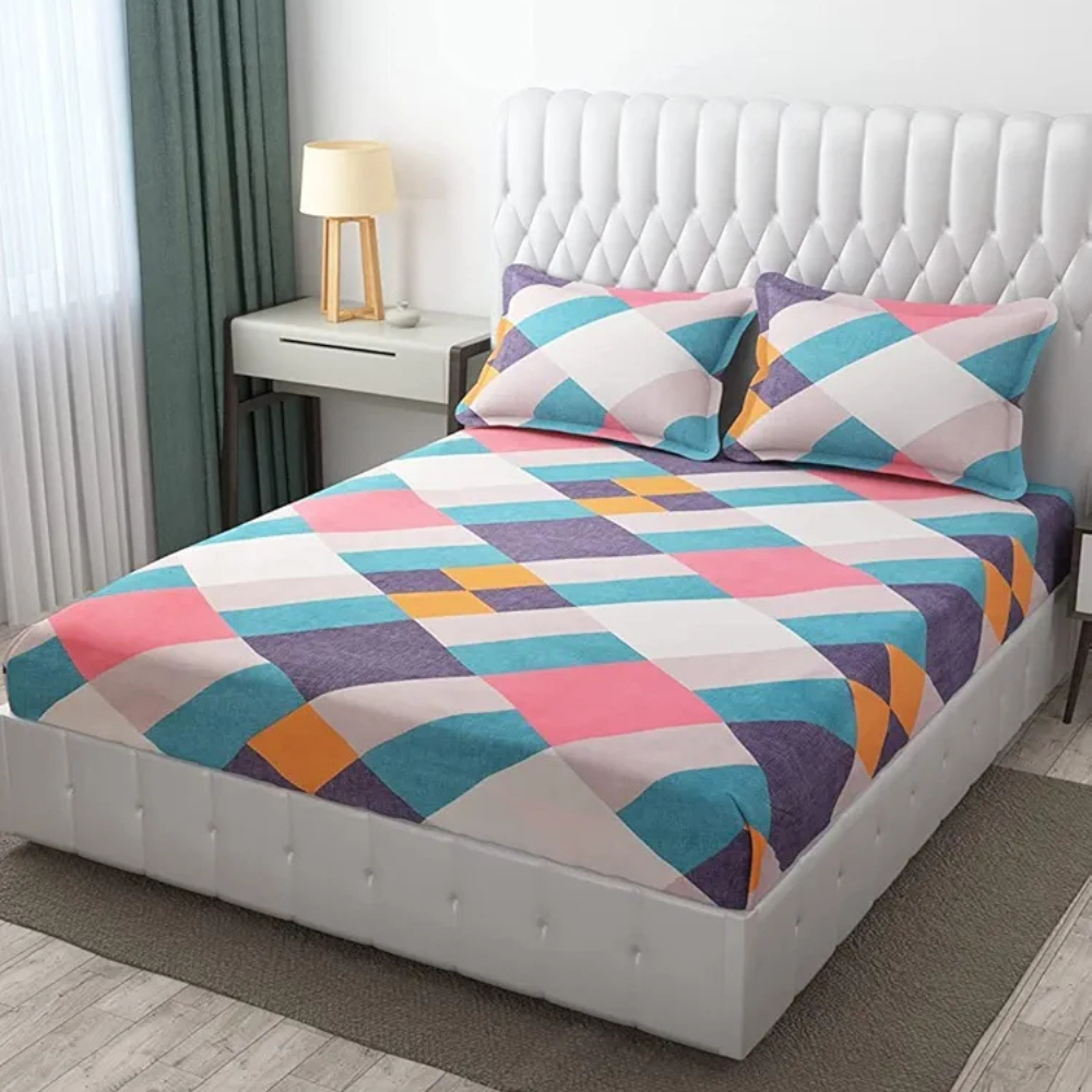 The Home Style Cotton Feel Glace Cotton All Around Elastic Fitted Printed Queen Size Double Bed Bedsheet With 2 Pillow Cover 300 TC Multicolor Abstract