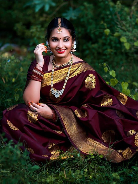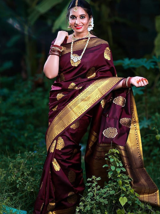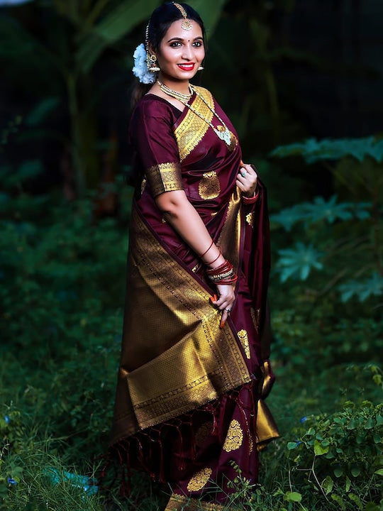 - Maroon and gold-toned banarasi saree
