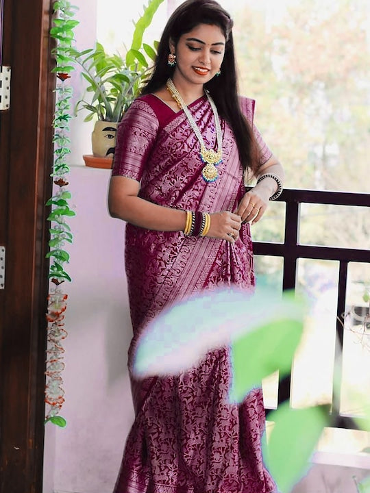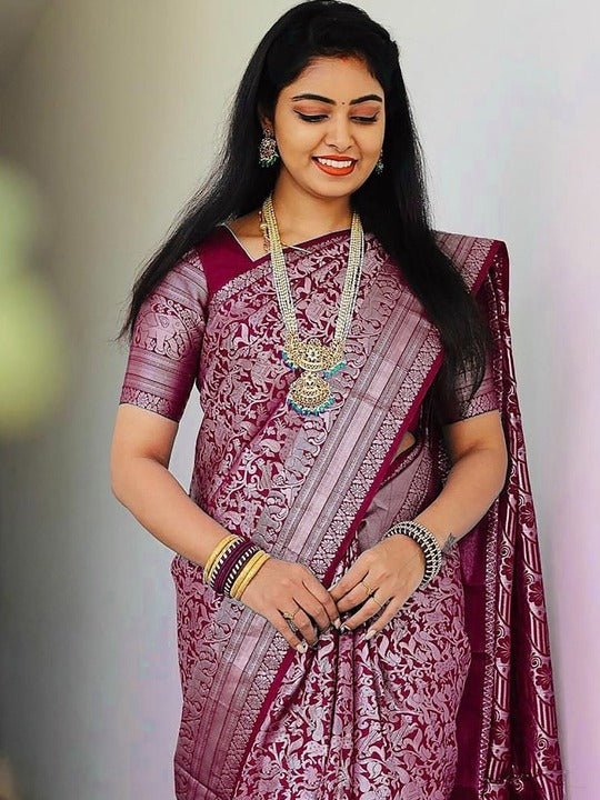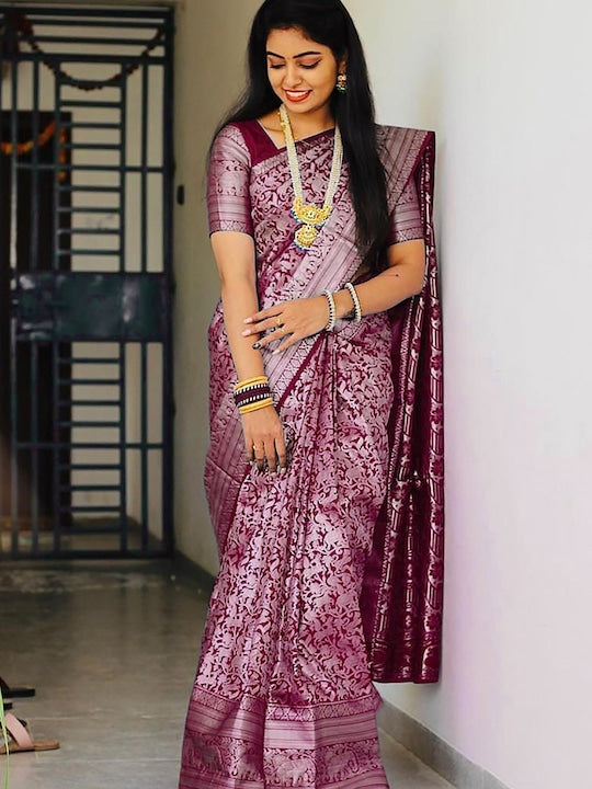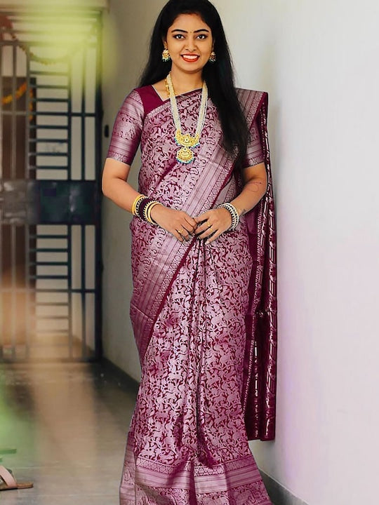 - Purple and silver-toned banarasi saree