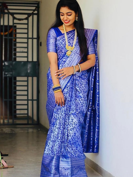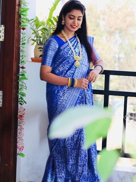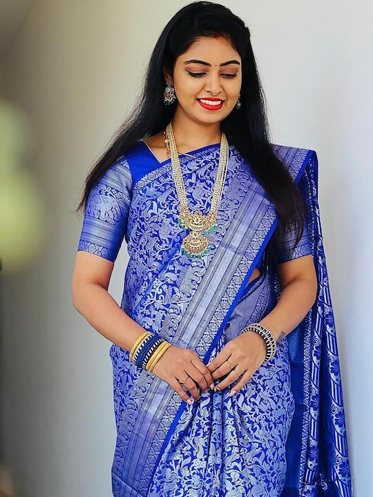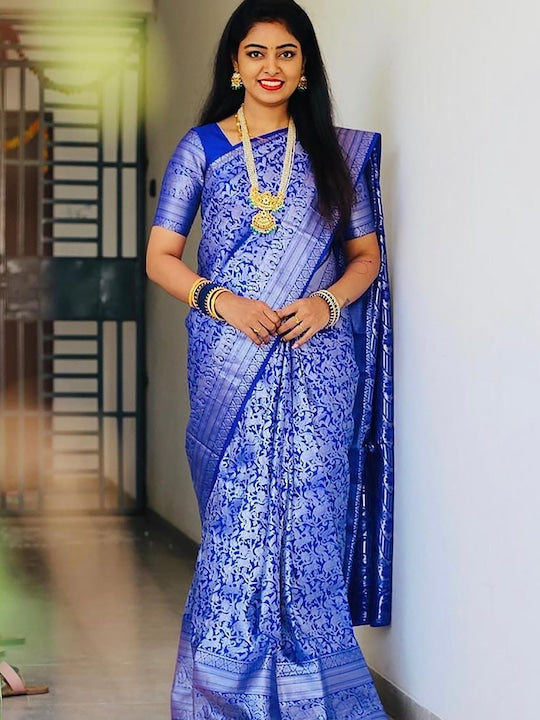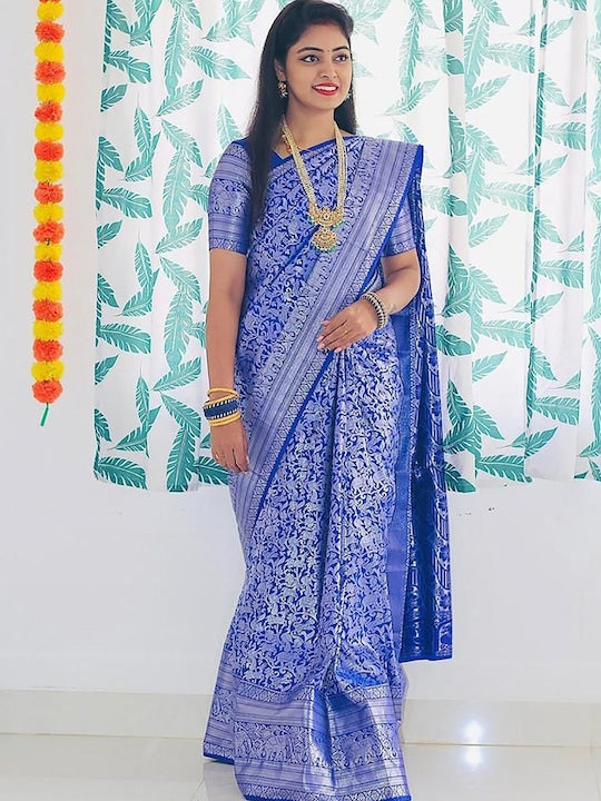 • Blue and silver-toned banarasi saree