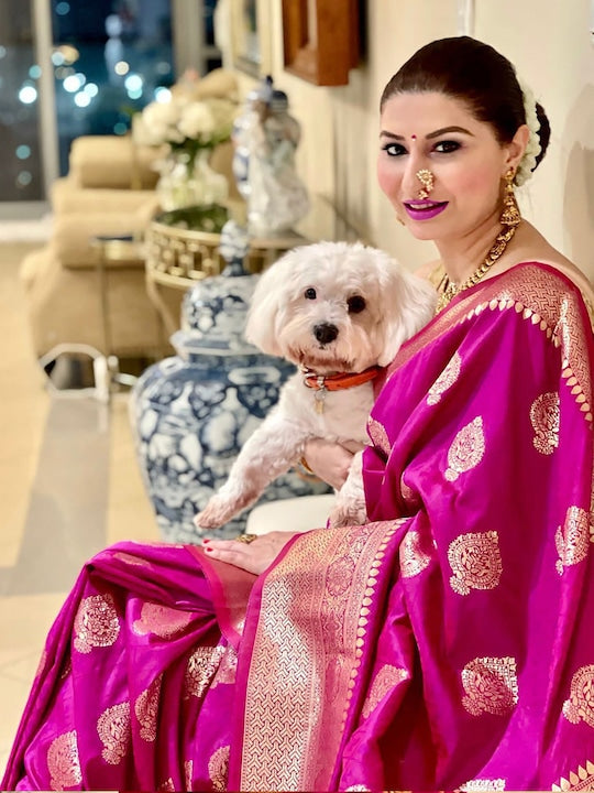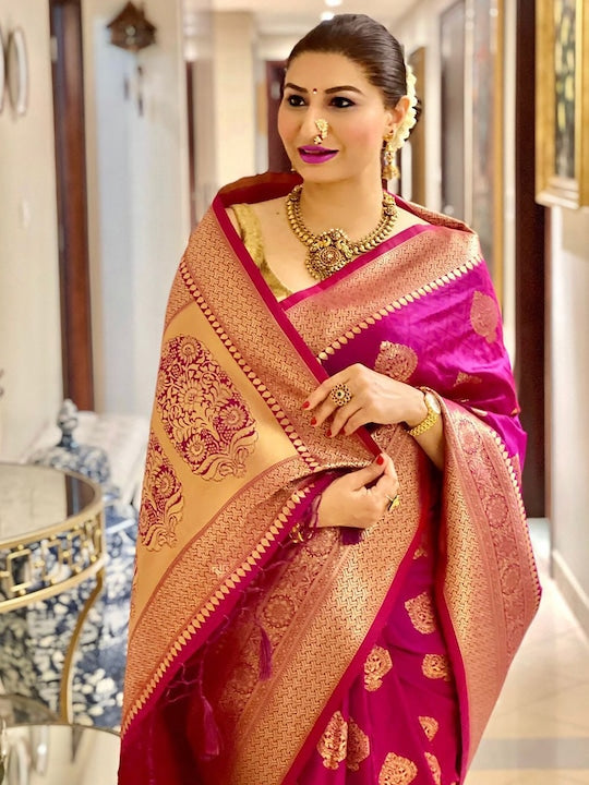 • Pink and gold-toned banarasi saree