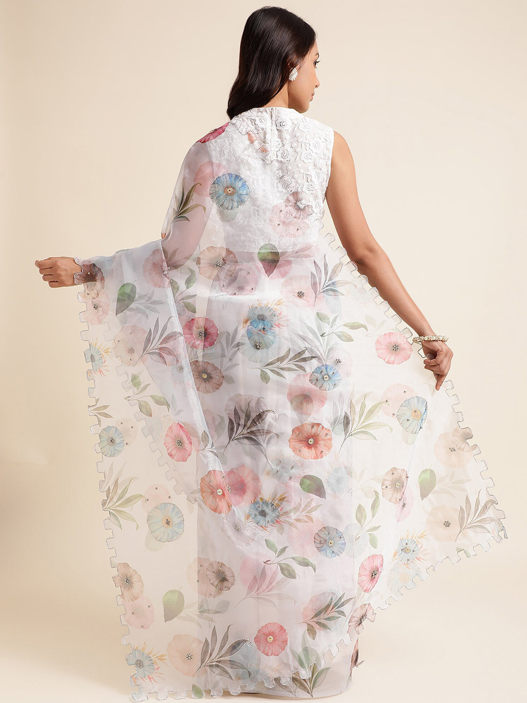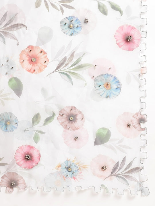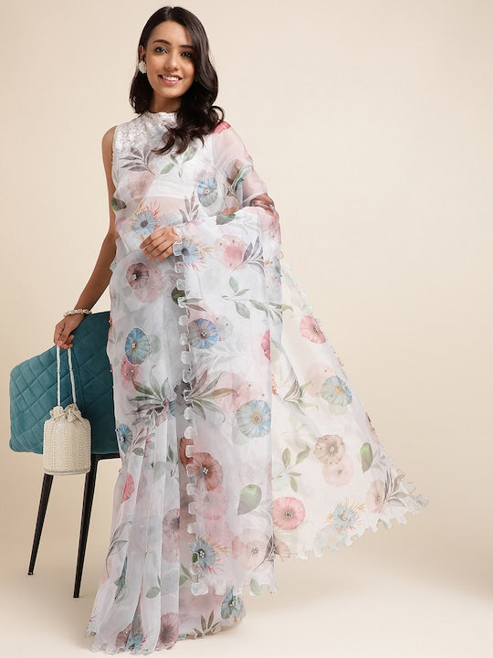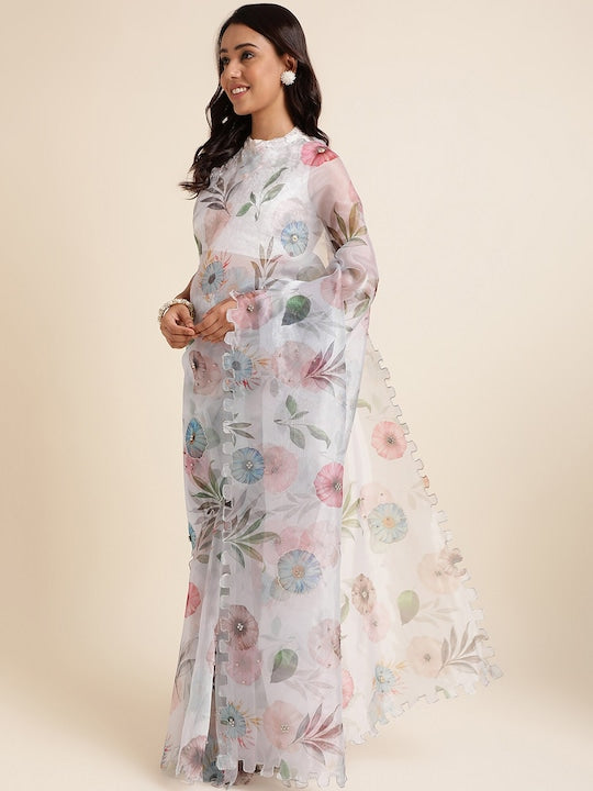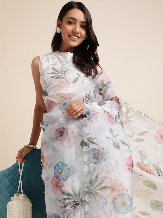 Fabmora Floral Printed Beads & Stones Embroidered Organza Saree
