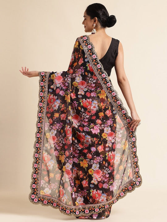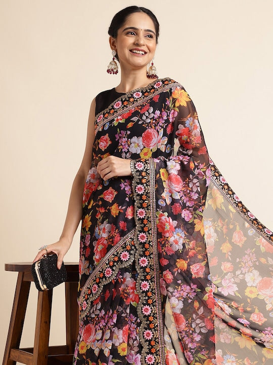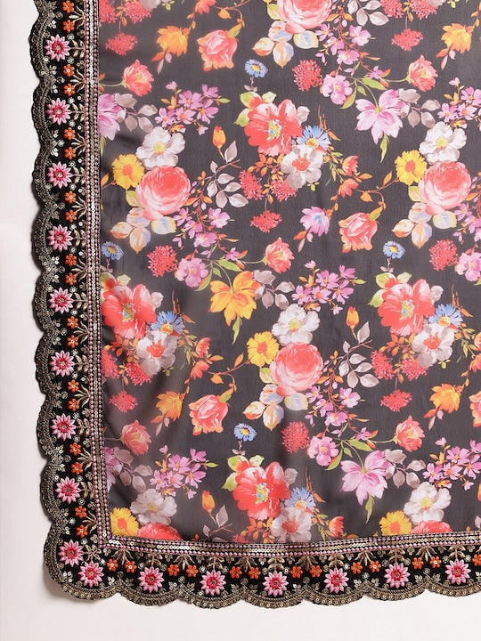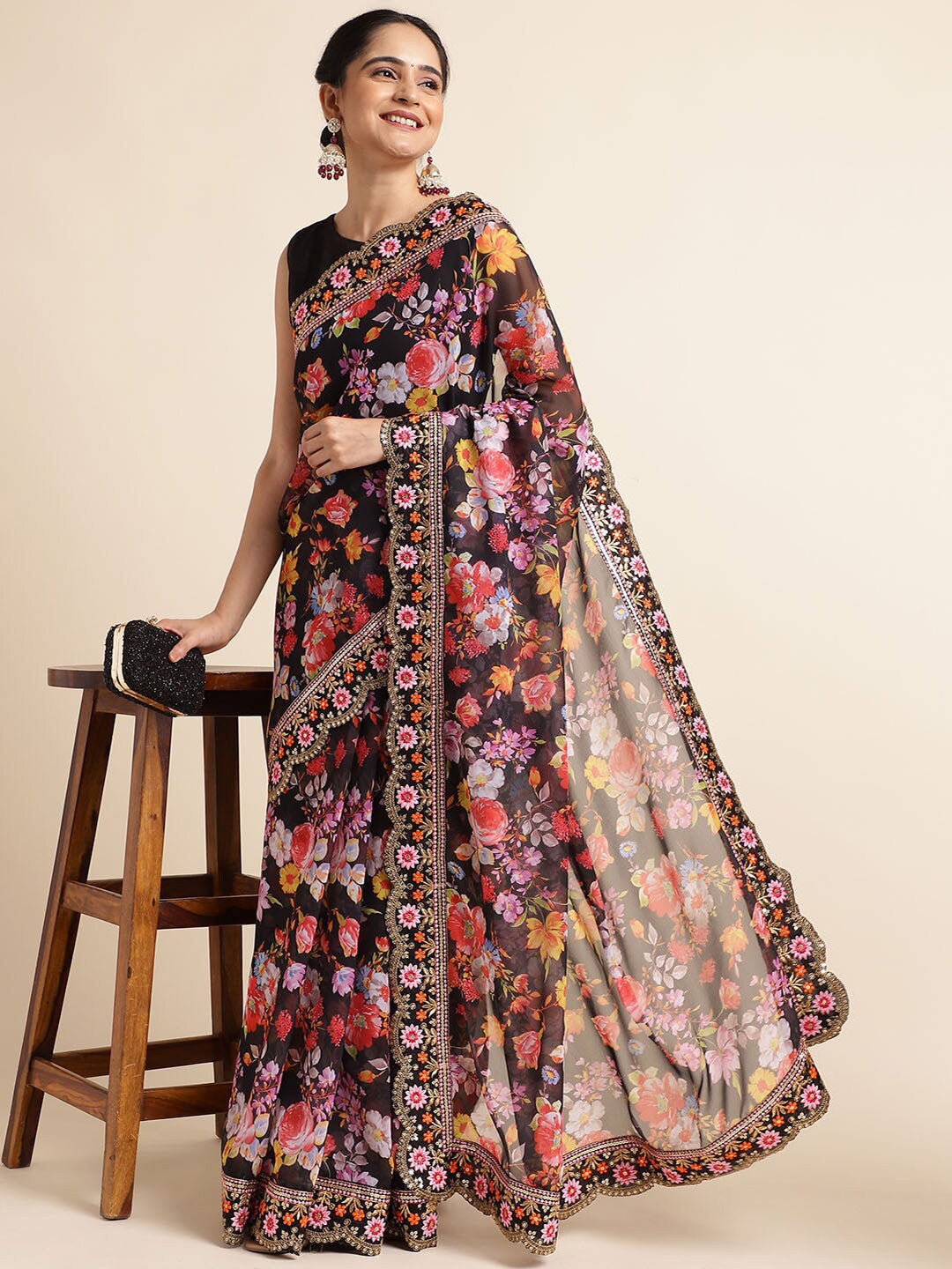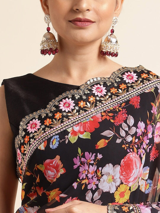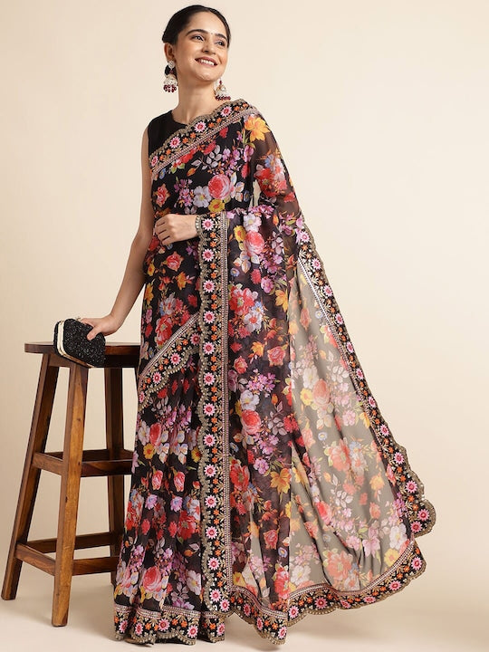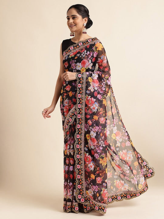 Fabmora Floral Printed Sequinned Pure Georgette Saree