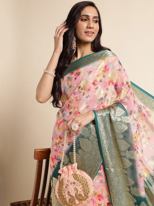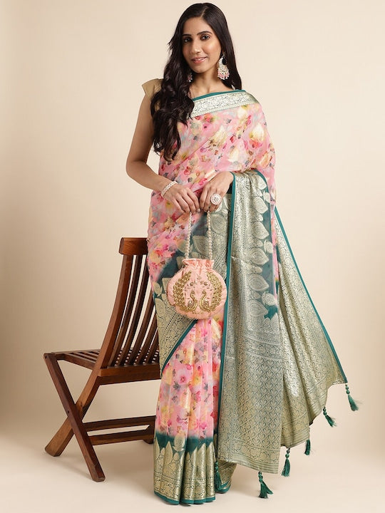 • Floral printed saree with woven design border