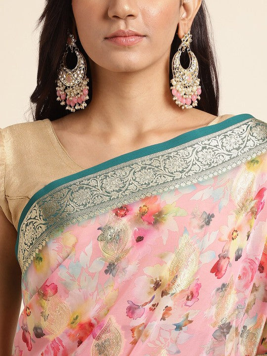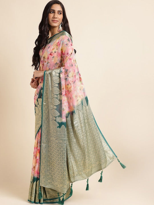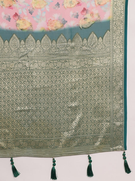 Fabmora Floral Zari Pure Georgette Saree with Tassels