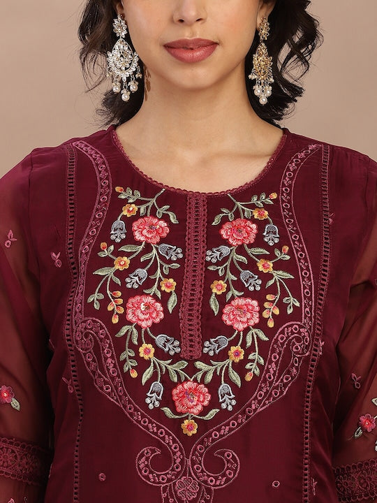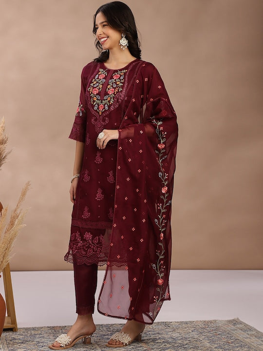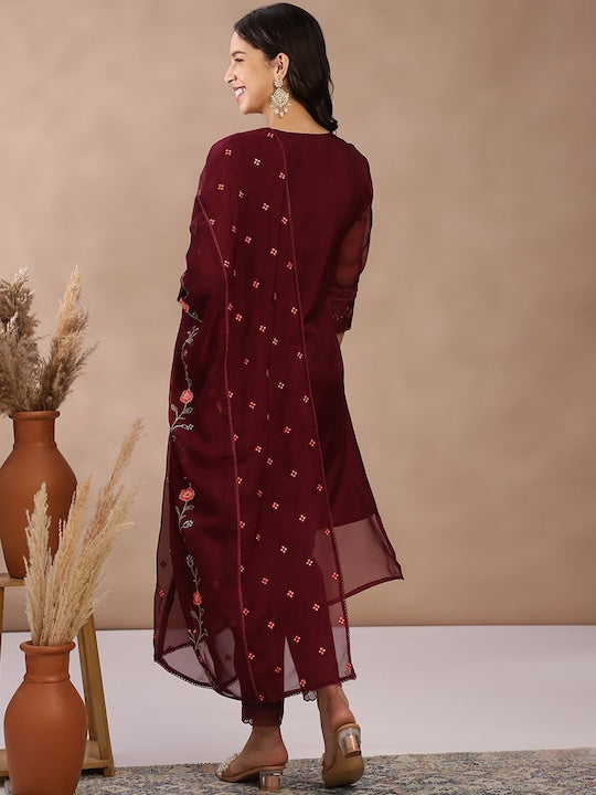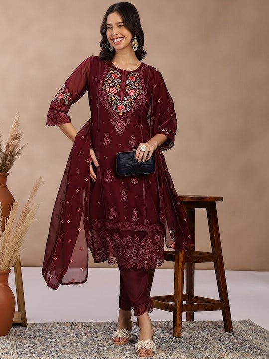 Fabmora Women Ethnic Motifs Embroidered Regular Thread Work Kurta with Trousers & With Dupatta