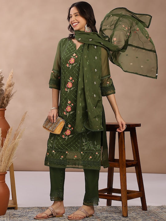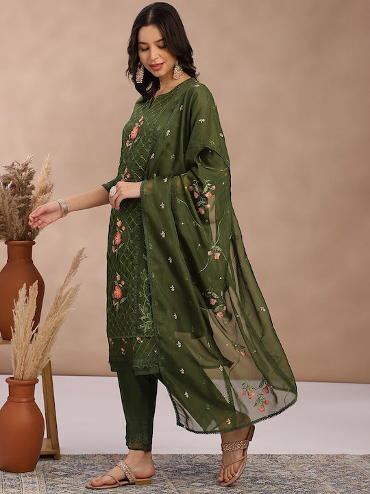 Fabmora Women Floral Embroidered Regular Kurta with Trousers & With Dupatta