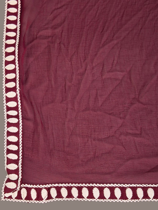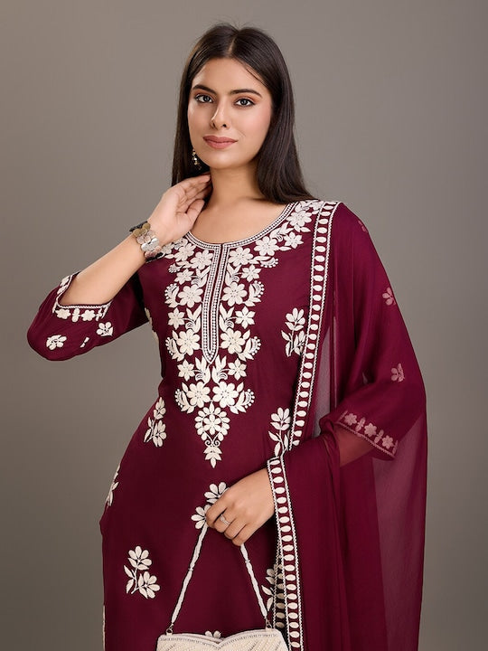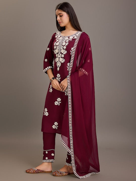 House of Pataudi Floral Embroidered Round Neck Kurta With Trousers & Dupatta