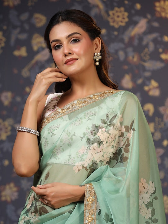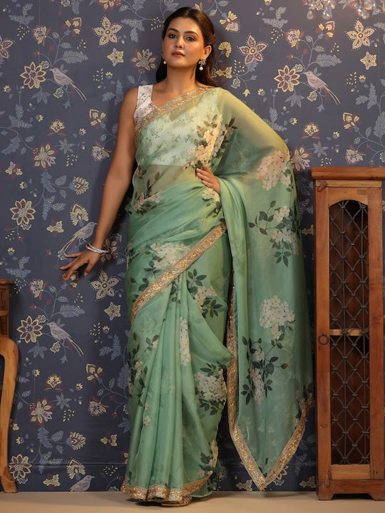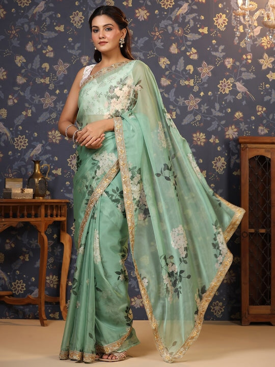 House of Pataudi Floral Printed Embroidered Organza Saree