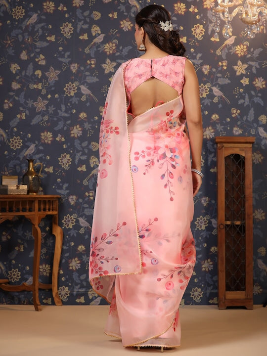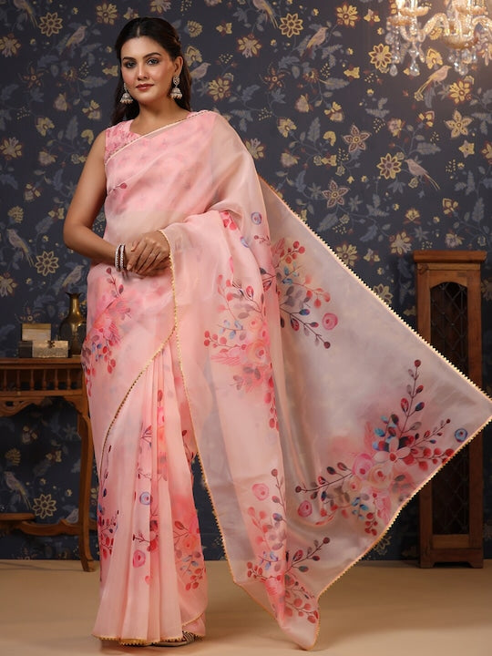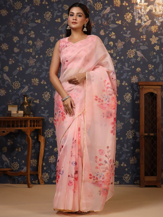 House of Pataudi Floral Printed Gotta Patti Organza Saree