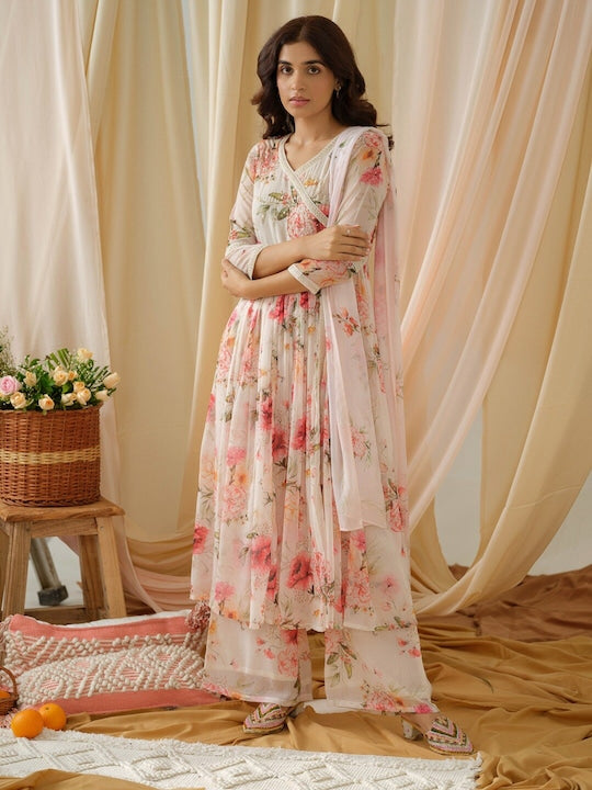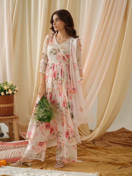 House of Pataudi Floral Printed V-Neck Empire A-Line Kurta and Trousers With Dupatta