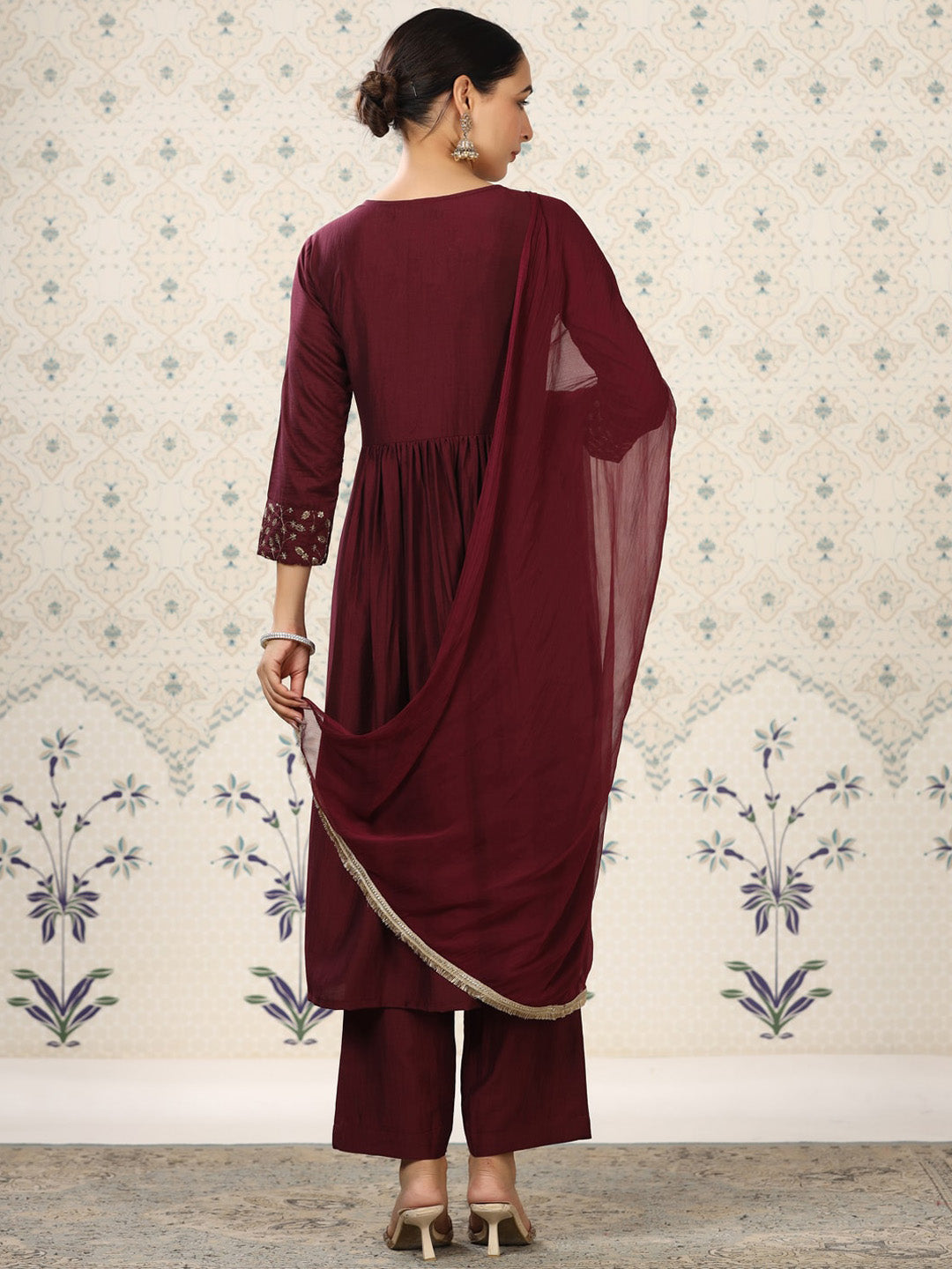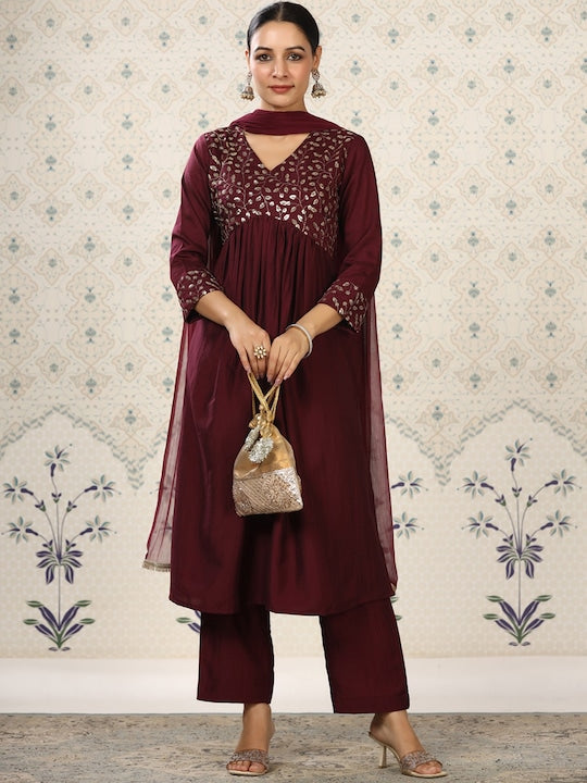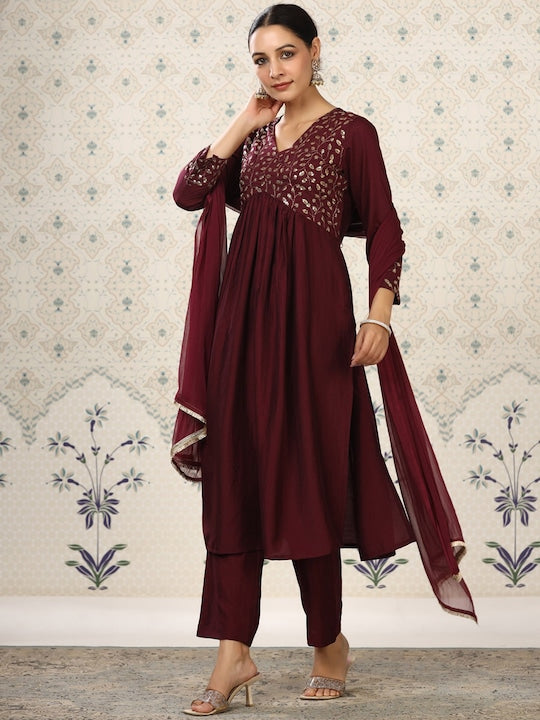 House of Pataudi Floral Yoke Design Sequinned Pleated Kurta With Trousers & Dupatta