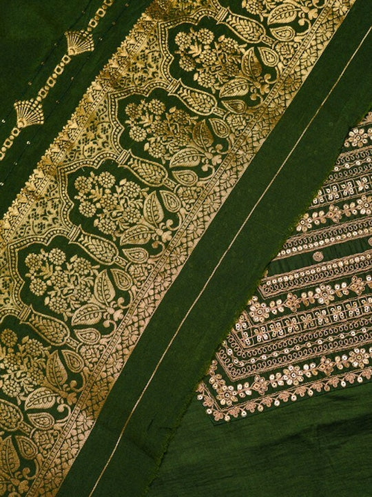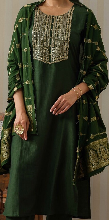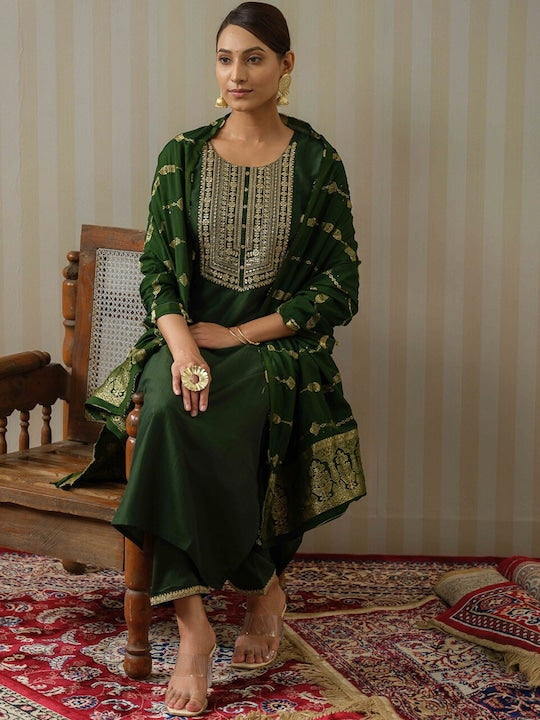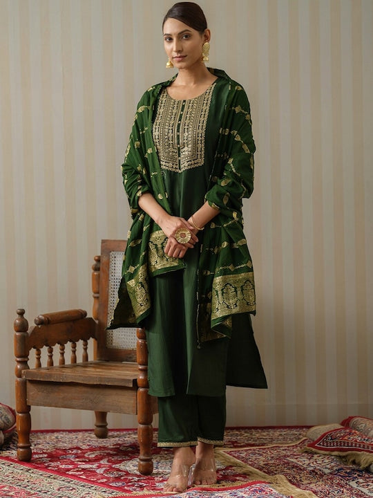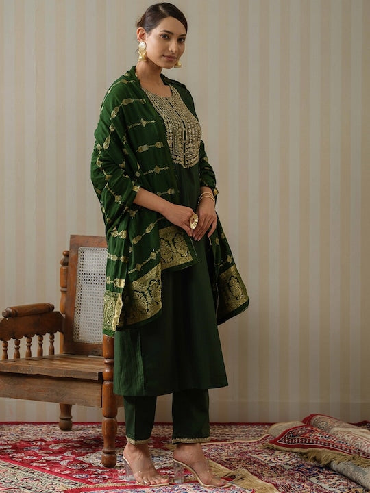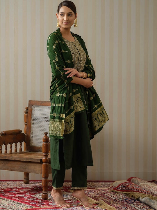 House of Pataudi Green Ethnic Motifs Straight Kurta & Trousers With Dupatta