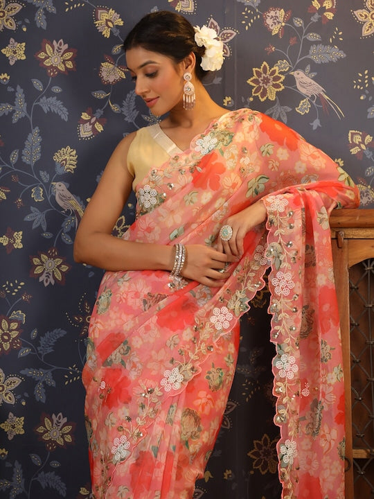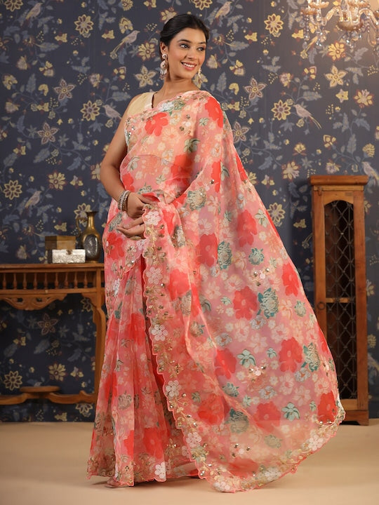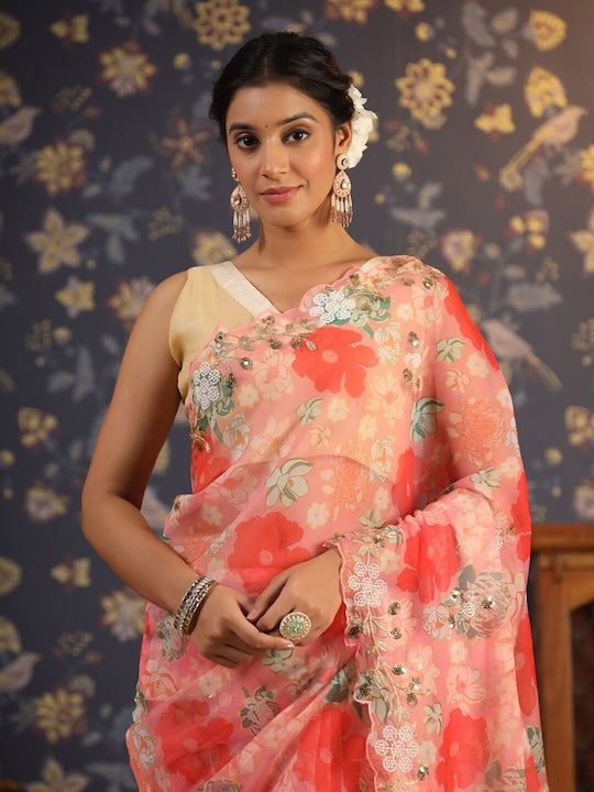 House of Pataudi Mauve & White Floral-Printed Beads & Stones Organza Saree
