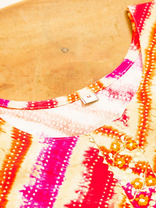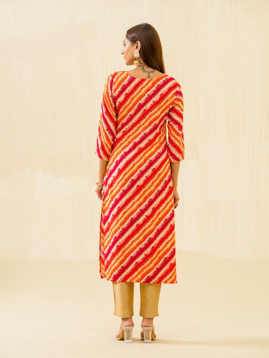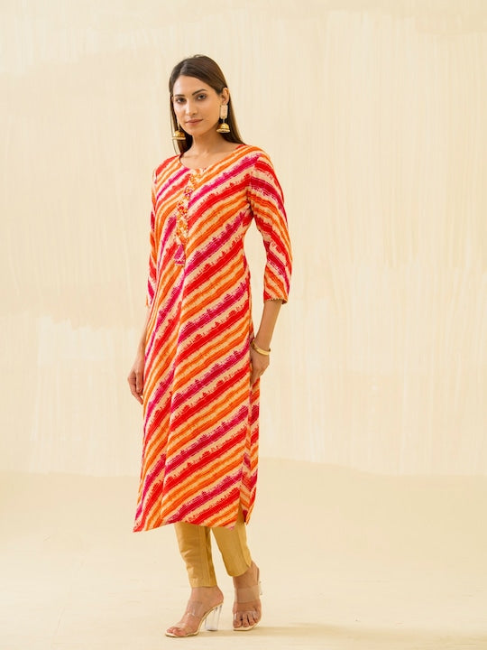 House of Pataudi Orange Striped Round Neck Gotta Patti Straight Kurta