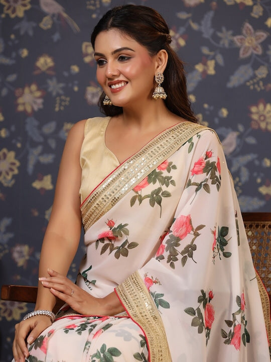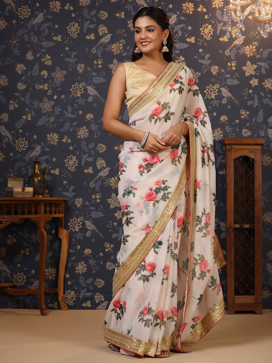 House of Pataudi Pure Georgette Floral Printed Sequinned Saree