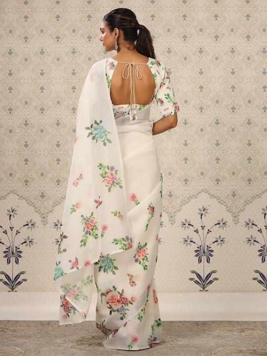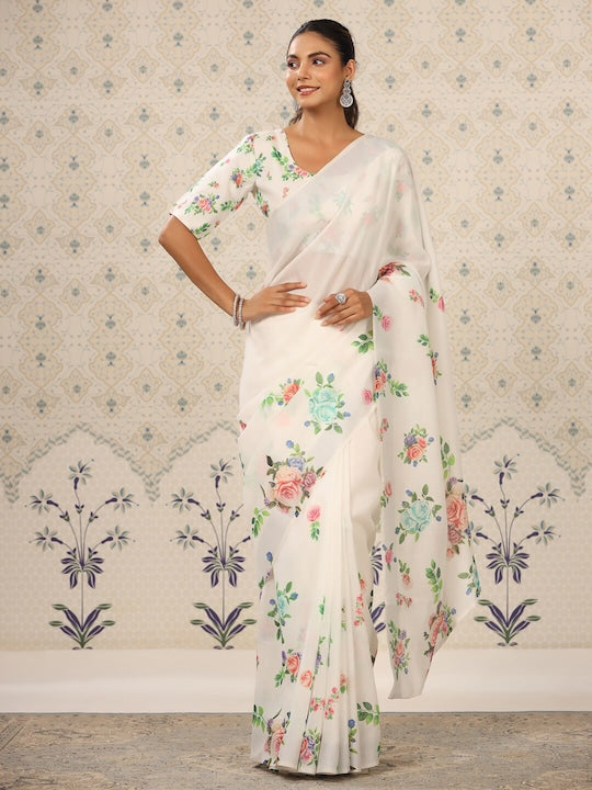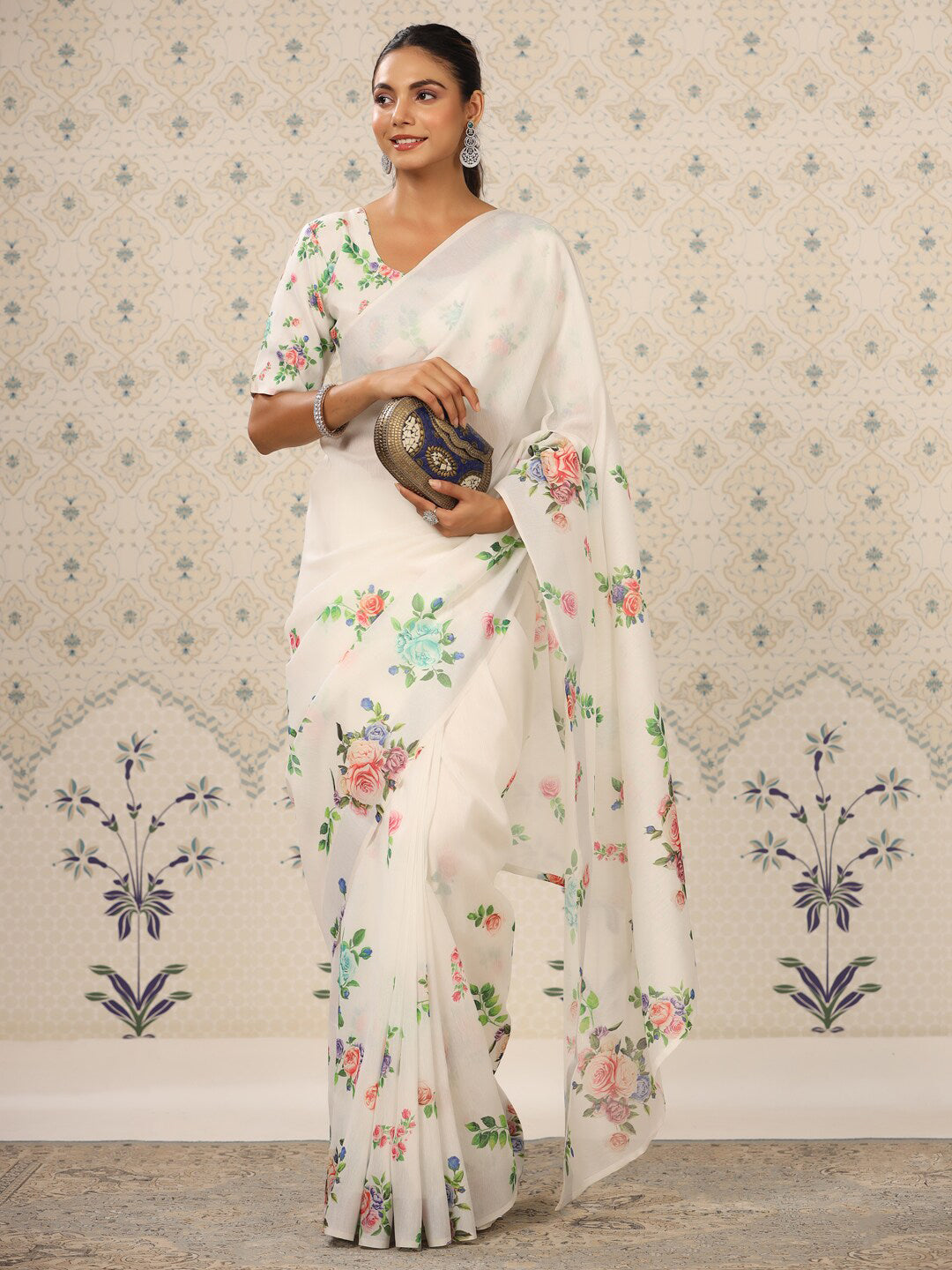 House of Pataudi White & Green Floral Printed Pure Linen Saree