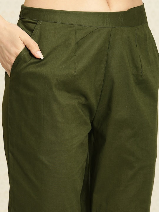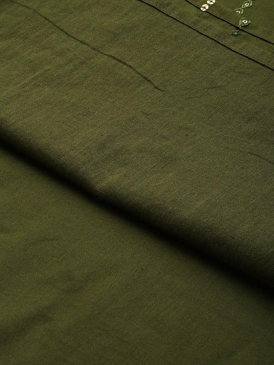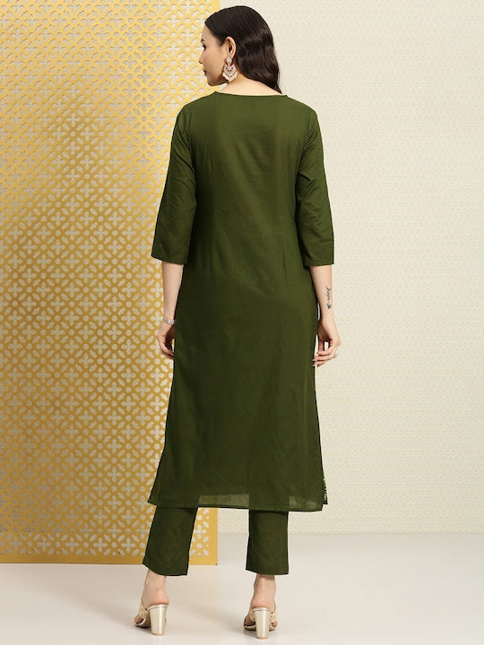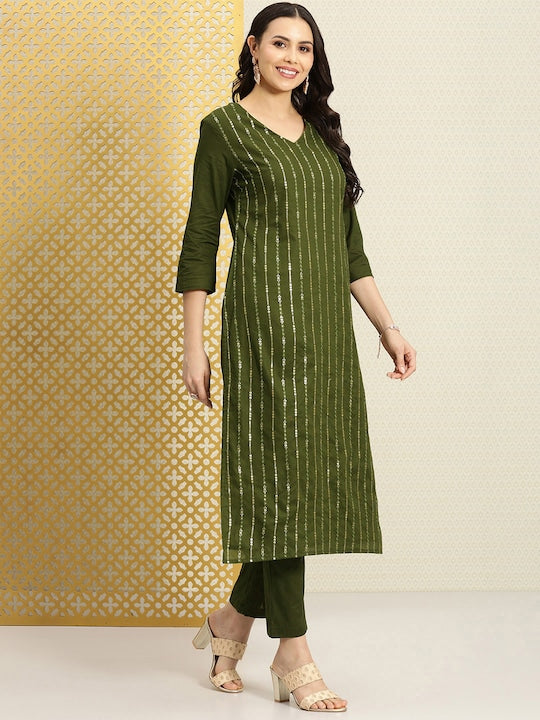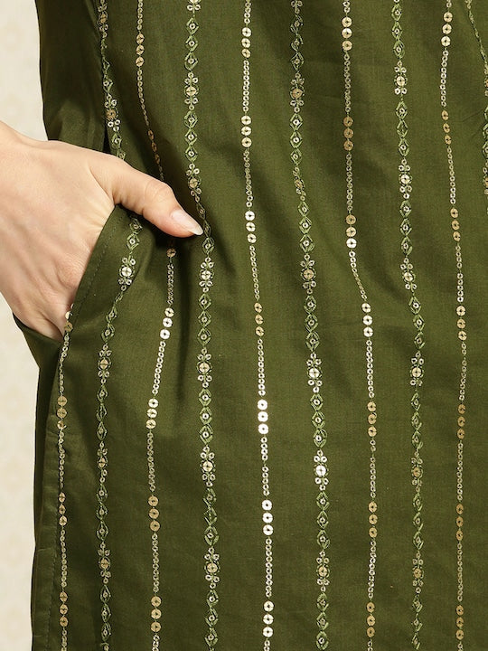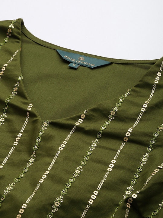 House of Pataudi Women Striped Sequinned Pure Cotton Kurta with Trousers Set