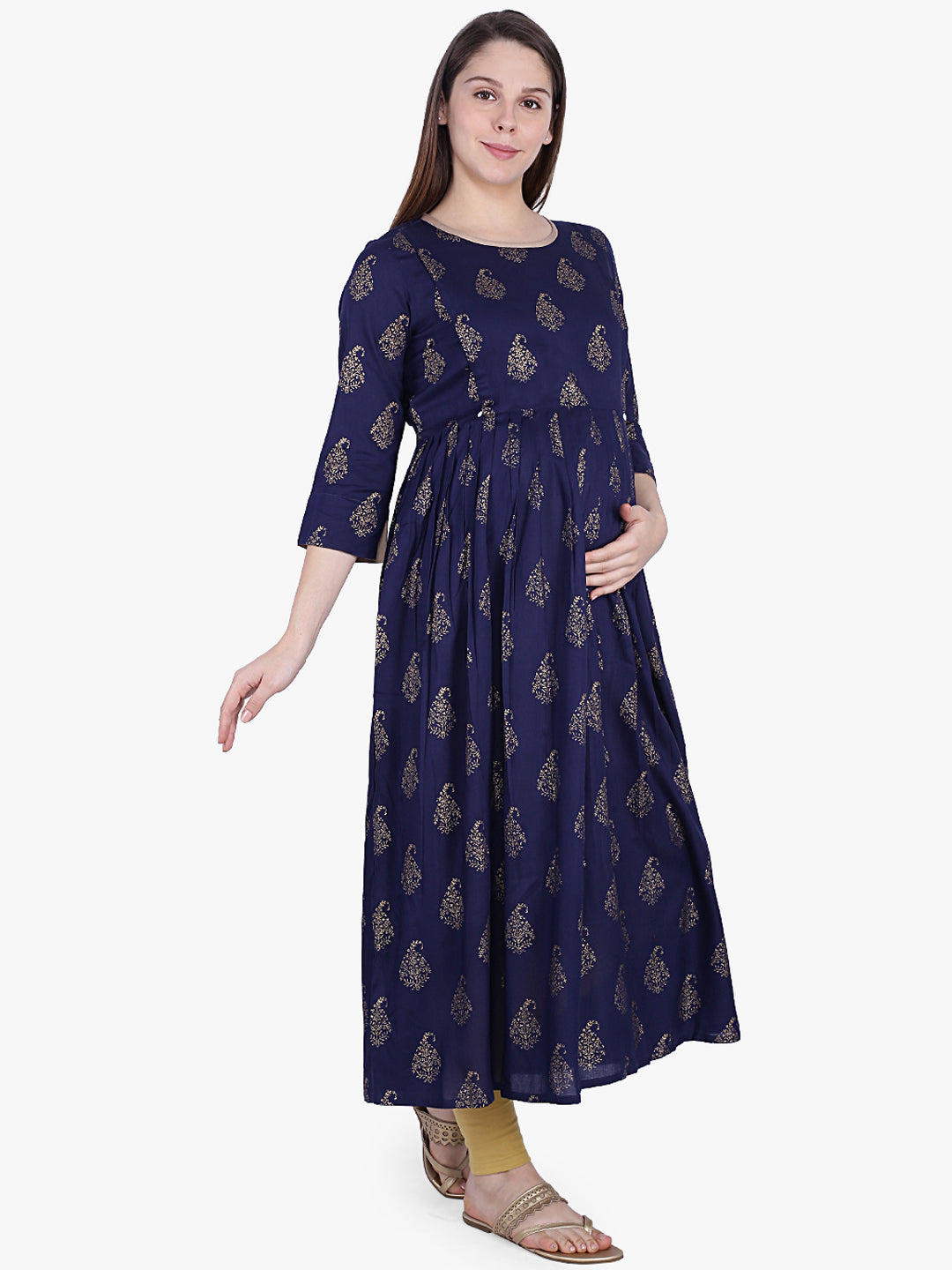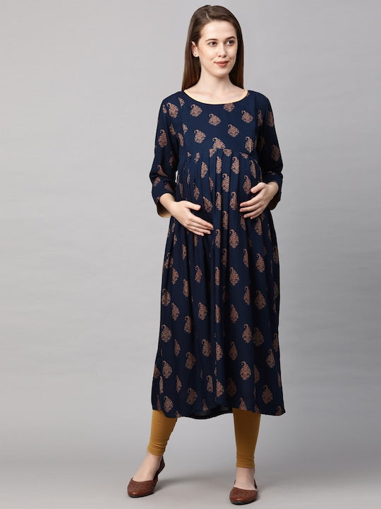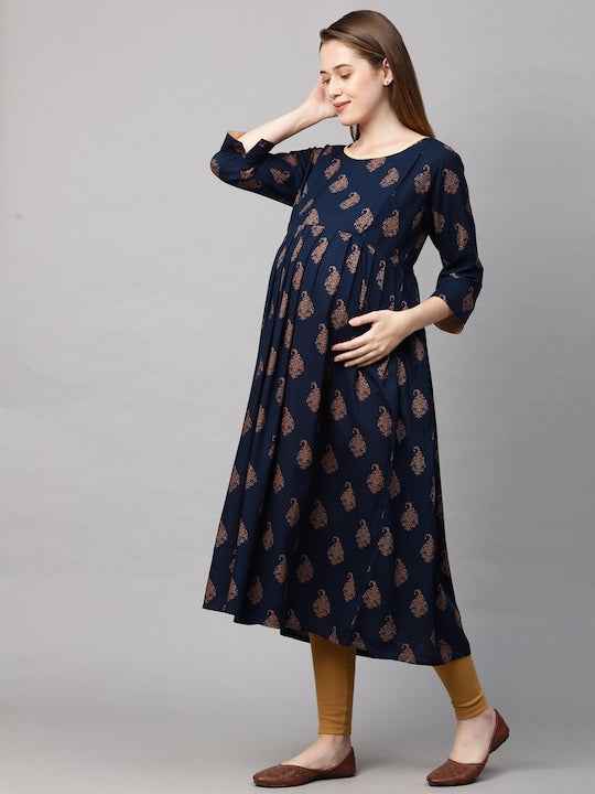 MomToBe Women Navy Blue Printed Maternity Nursing Anarkali Kurta