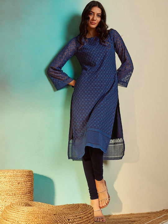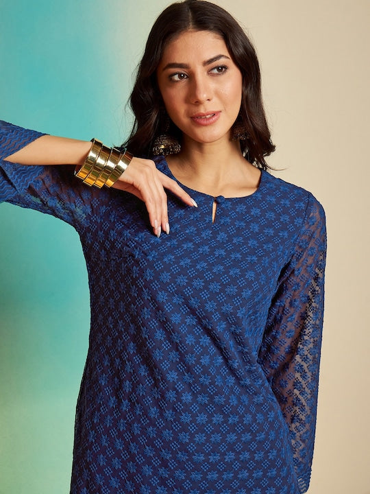 Sangria Floral Embroidered Keyhole Neck Flared Sleeves Thread Work Kurta