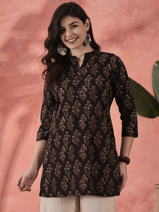 • Brown & beige Printed short tops with mandarin collor, side slit with Placket and buttons