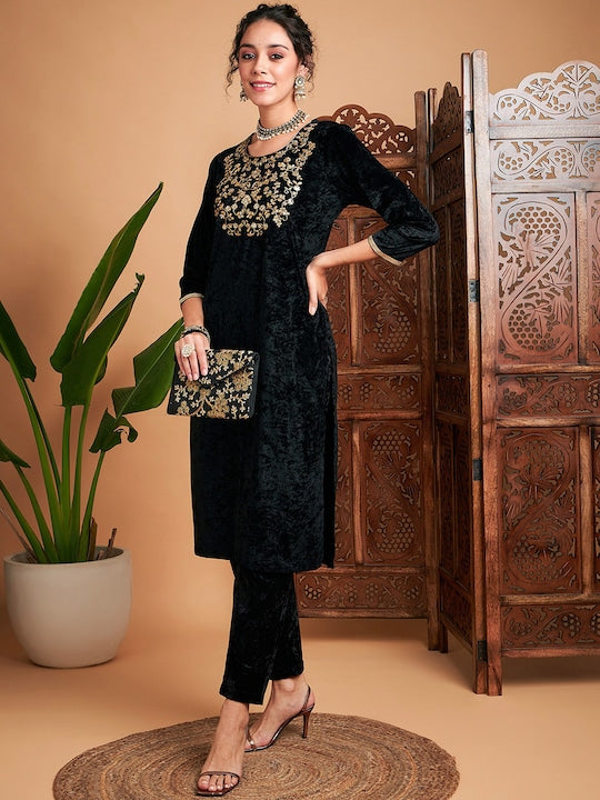 Shae by Sassafras Black Floral Yoke Design Thread Work Detail Velvet Straight Kurta