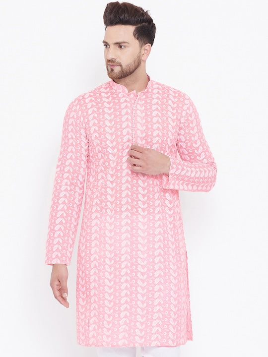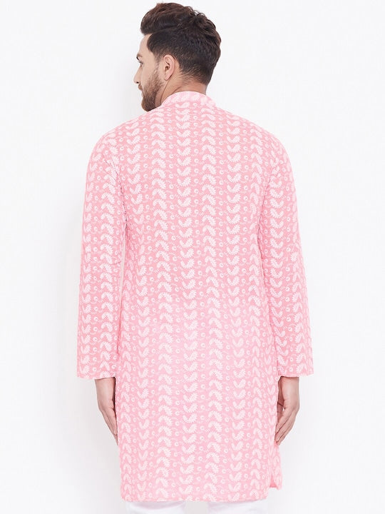 Vastramay Men Pink & White Ethnic Motifs Embroidered Chikankari Cotton Kurta