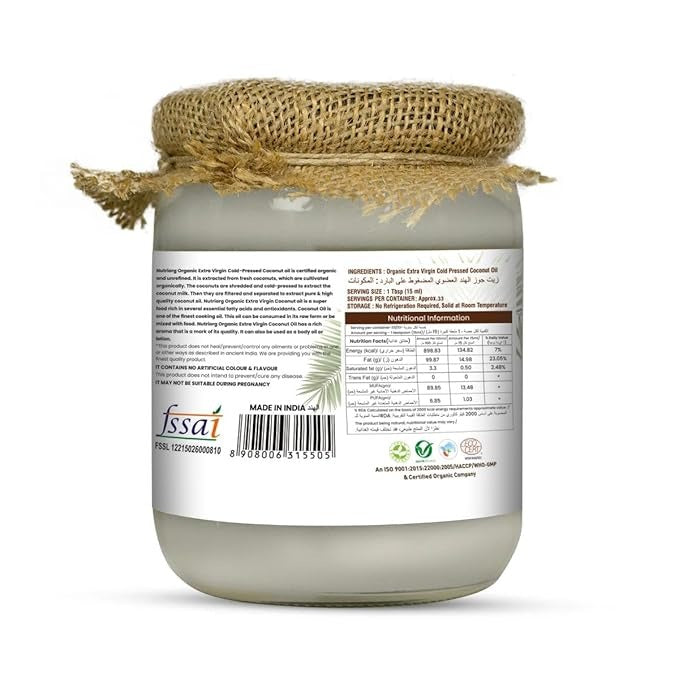 - 100% Pure & Organic: Extra Virgin Cold-Pressed Coconut Oil by Nutriorg retains all the nutritional value of the oil. It is made from high-quality, organically grown coconuts; therefore, unprocessed, unbleached, and free from additives to offer value in its most natural, purest form.