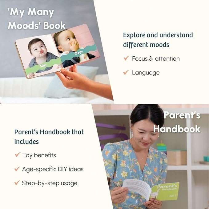 - Ultimate Play Set: The Curious Cub Montessori toys for 1+ year olds include 6 thoughtfully selected baby toys. This playset features a ball tracker, pop-up pegs, a flexible ring stacker, "My Many Moods" flashcard sets, and a parent’s handbook.