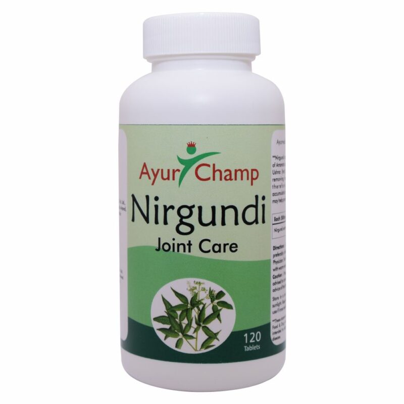 - Ayur Champs Nirgundi tablet has antioxidant, anti-inflammatoary properties. It may help in the management of Amavata due to its Vata balancing and Ushna (hot) properties.