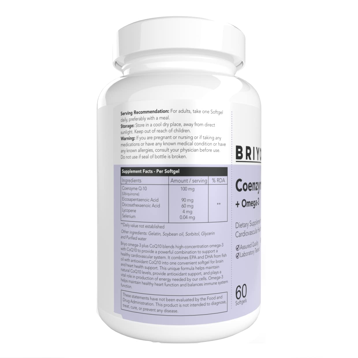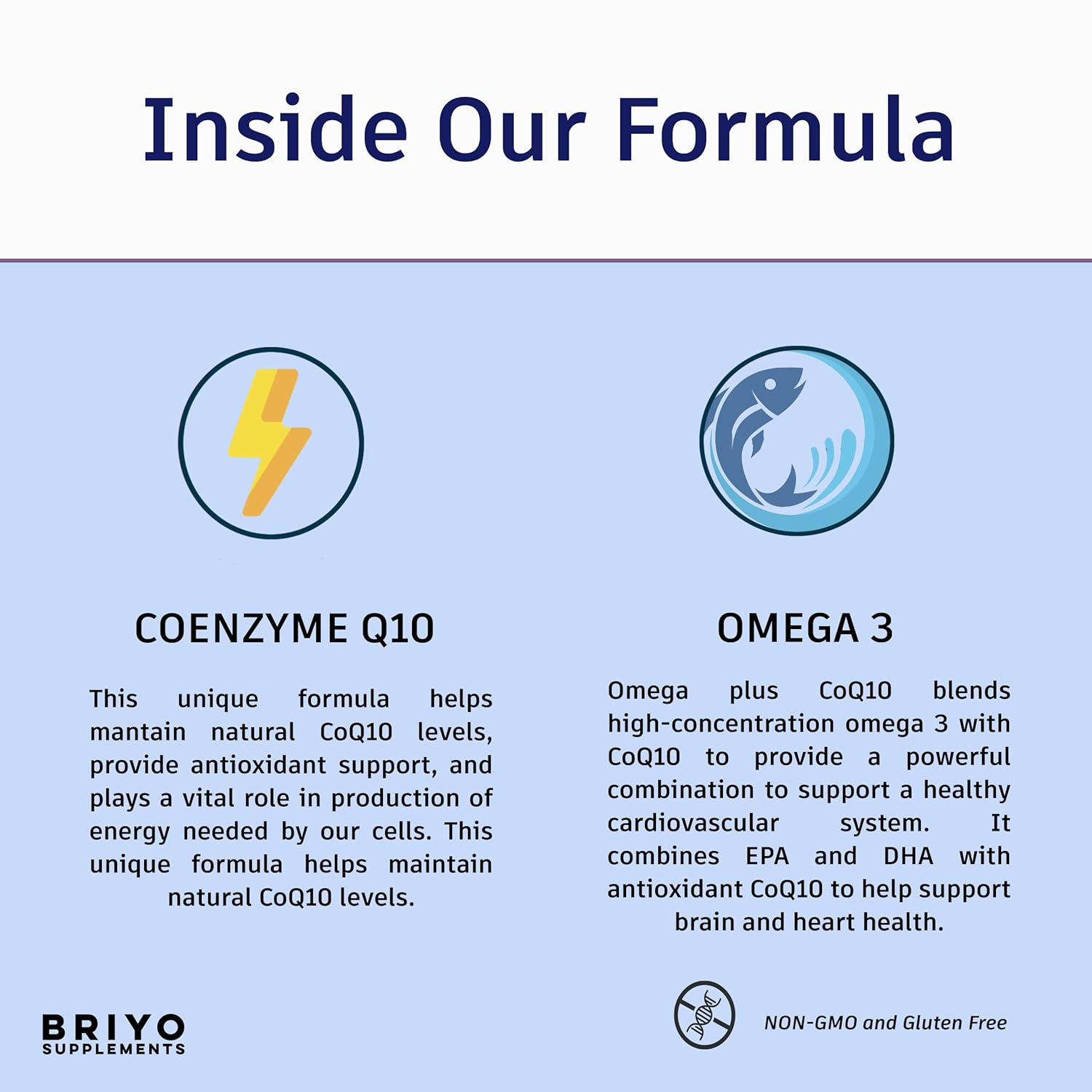 • Briyo Omega + CoQ10 combines high-potency, concentrated fish oil and Coenzyme Q10 (CoQ10) for cardiovascular health, normal cellular energy levels, and antioxidant support. This unique formula helps maintain natural CoQ10 levels, which have been shown to decrease with age.