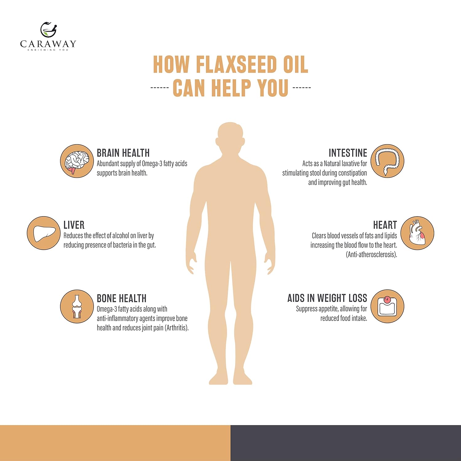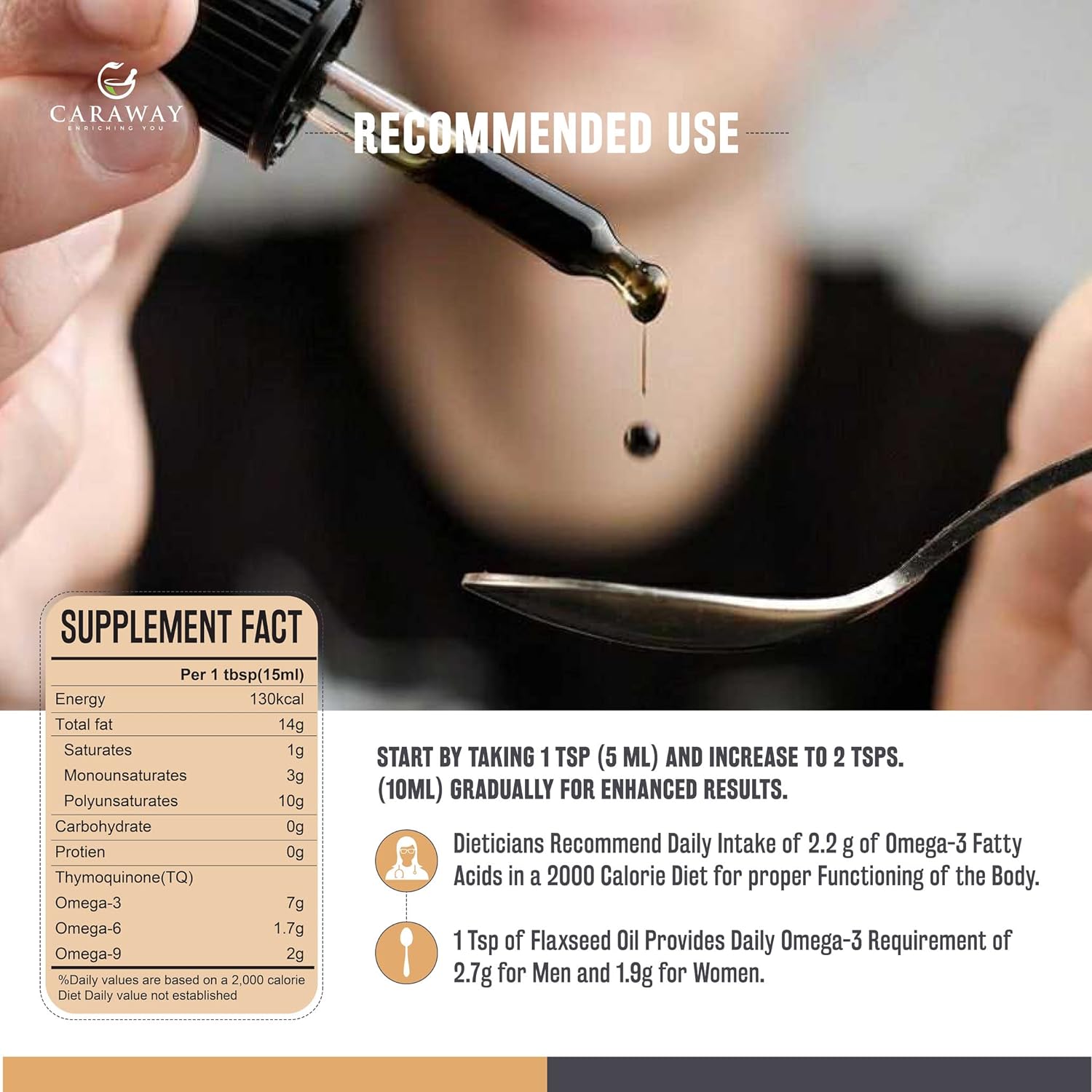 • RECOMMENDED DOSAGE - 1 tsp (5 ml) of CARAWAY Flaxseed oil provides daily Omega-3 requirement of 2.7g for men and 1.9g for women. Omega-3 fatty acid is converted into ALA by the body.