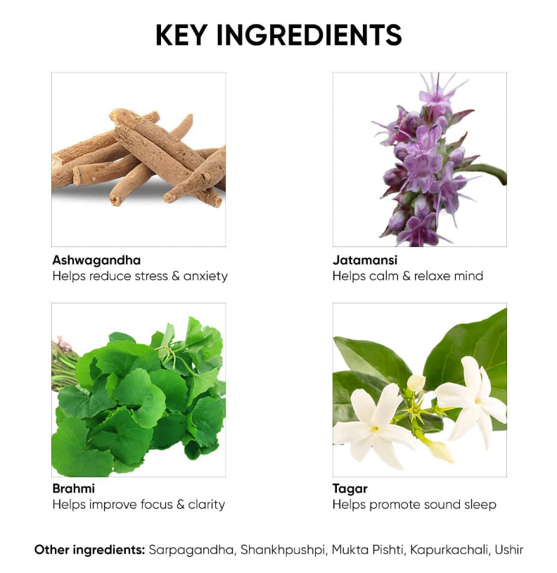 • Contains natural herbs like Ashwagandha, Jatamansi, Brahmi, and Tagar.
