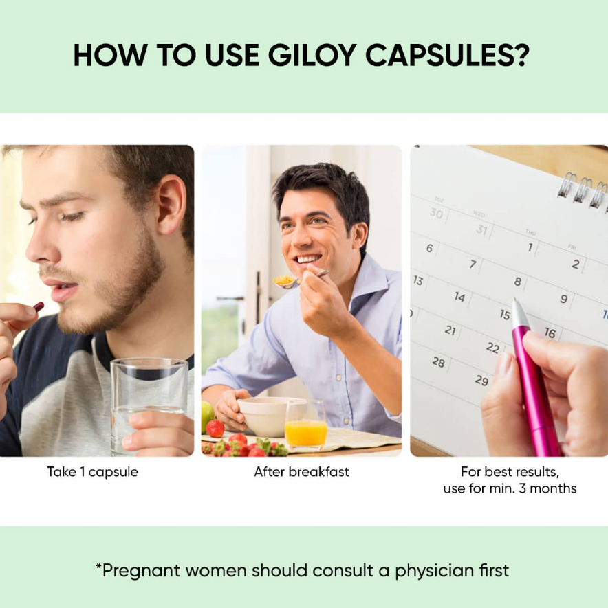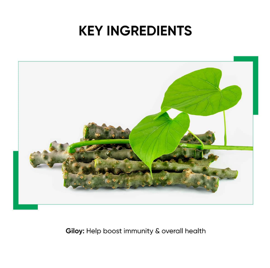 - The Giloy medicine is made to boost immunity and overall health. It includes 100% pure ayurvedic Giloy, which is full of antioxidants and helps release toxins from the body.