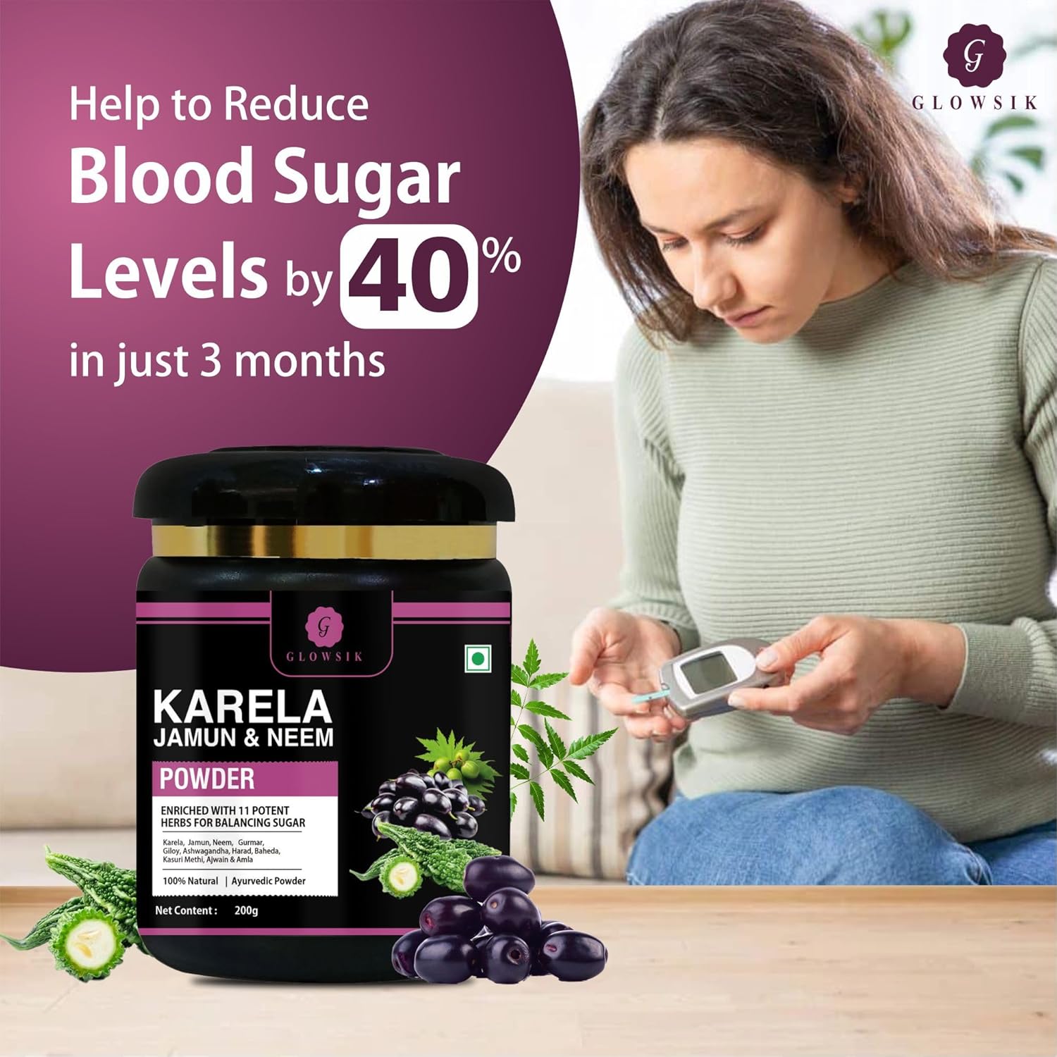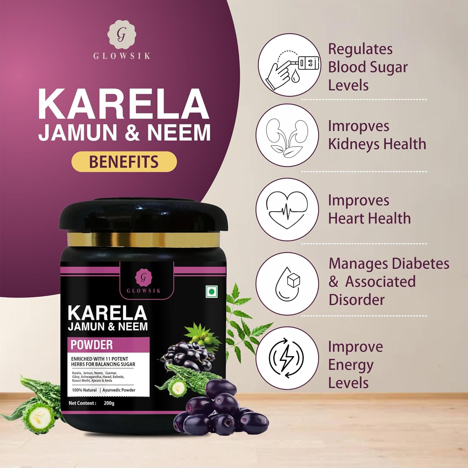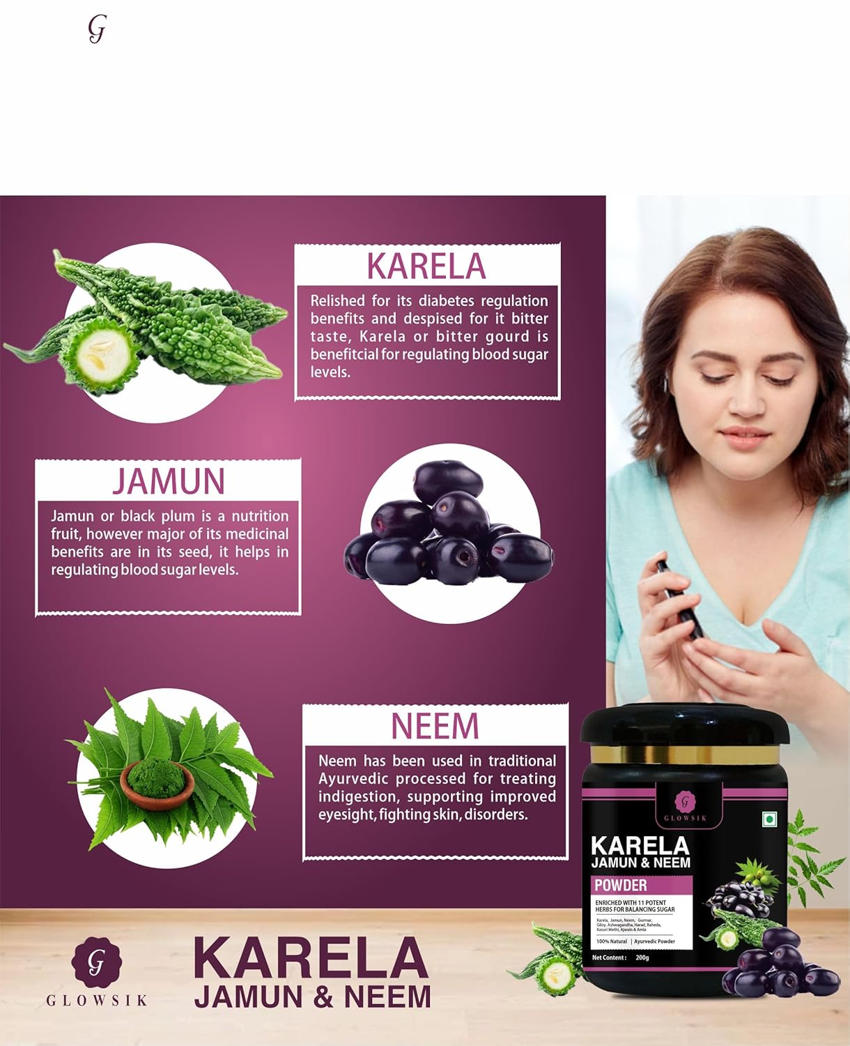 - Ayurvedic Blend for Sugar Management: The GLOWSIK Karela Jamun Powder is a powerful fusion of bitter gourd (Karela) and Indian blackberry (Jamun), both known for their ability to help in maintaining healthy sugar levels naturally. This 100% Ayurvedic formulation offers an effective solution for support in daily sugar management and overall well-being.