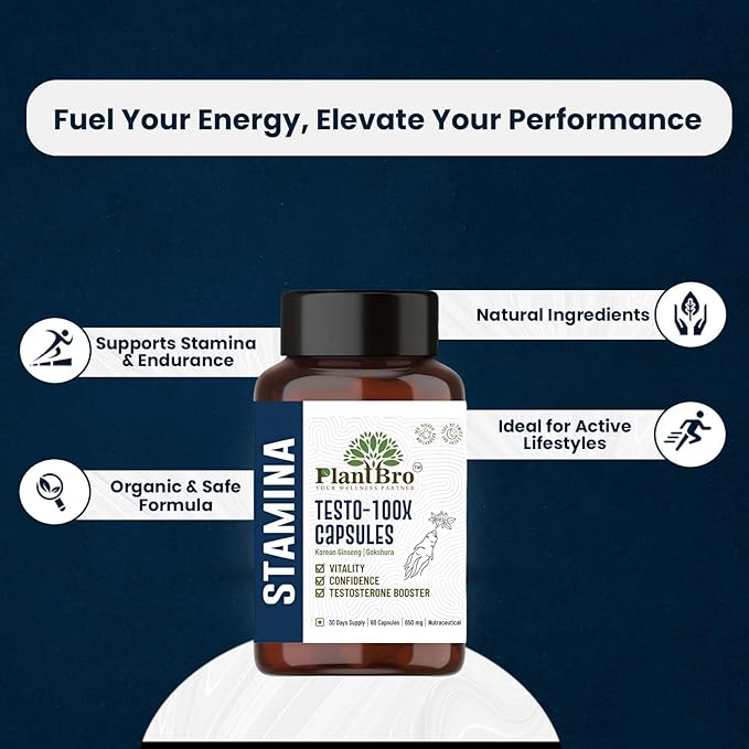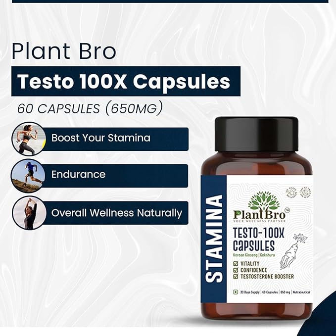 - Enhances Overall Wellness: Beyond helping in stamina and energy, Plant Bro Testo 100X Capsules support your body’s natural immunity and recovery processes. The powerful combination of Korean Ginseng and Gokshura helps combat oxidative stress, promotes better metabolism, and supports mental clarity, ensuring holistic well-being for a healthier and more balanced lifestyle.