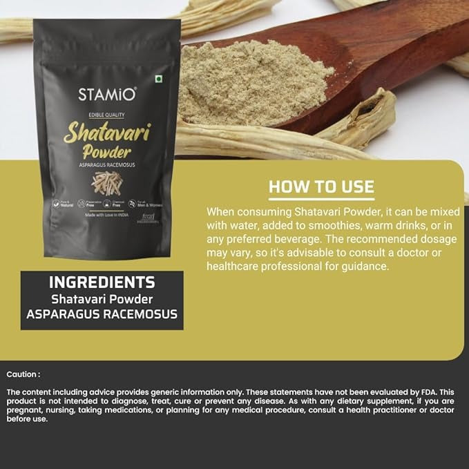• When consuming Shatavari Powder, it can be mixed with water, added to smoothies, warm drinks, or in any preferred beverage. The recommended dosage may vary, so it's advisable to consult a doctor or healthcare professional for guidance.