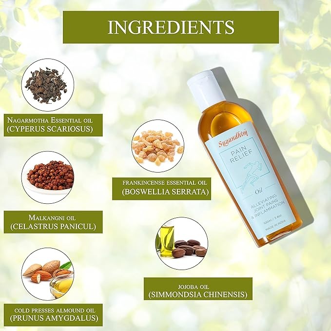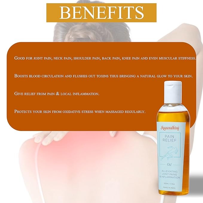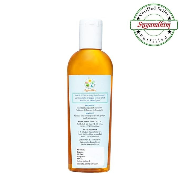 - Sugandhim Pain Relief Oil is moisturising & aromatically calming blend of potent ingredients that melt the stress away by giving instant relief from joint pain, and local inflammation.