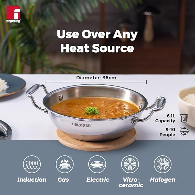 Bergner Argent Triply Stainless Steel 36 Cm Kadai With Stainless Steel Lid