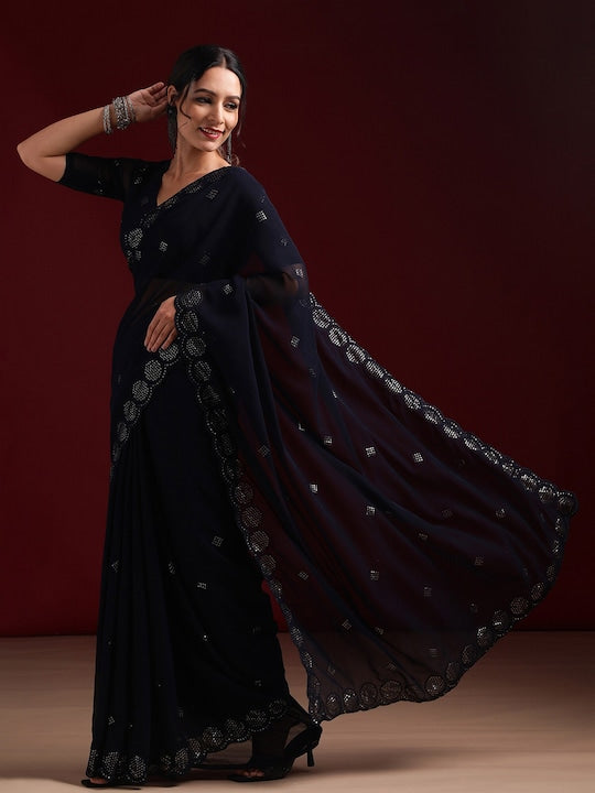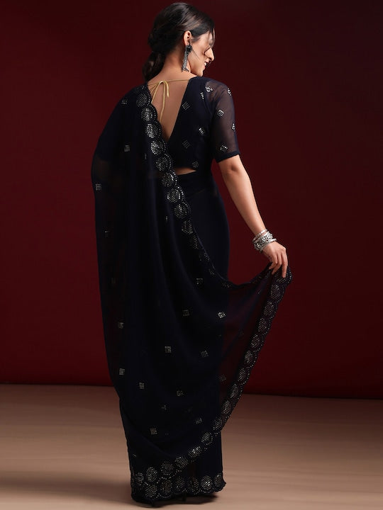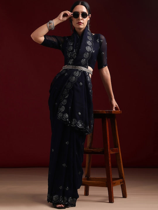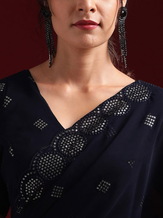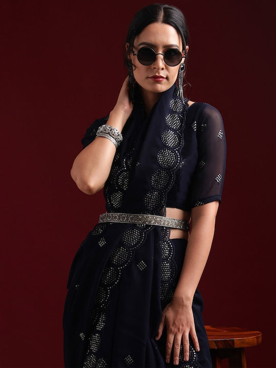 • Navy blue and silver-toned saree