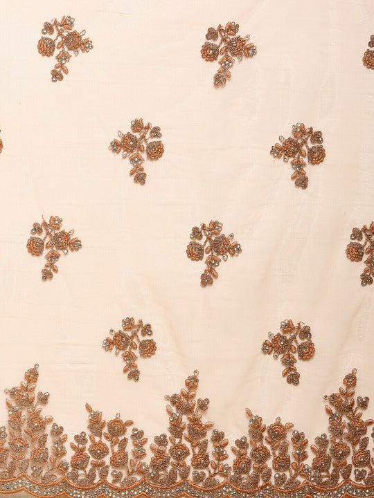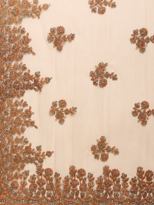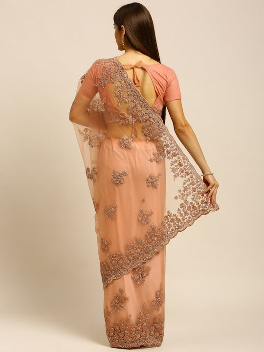 Kasee Peach-Coloured & Silver-Toned Floral Embroidered Net Saree