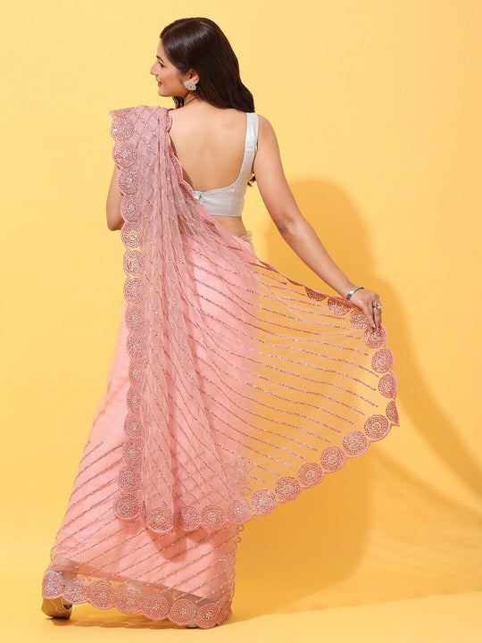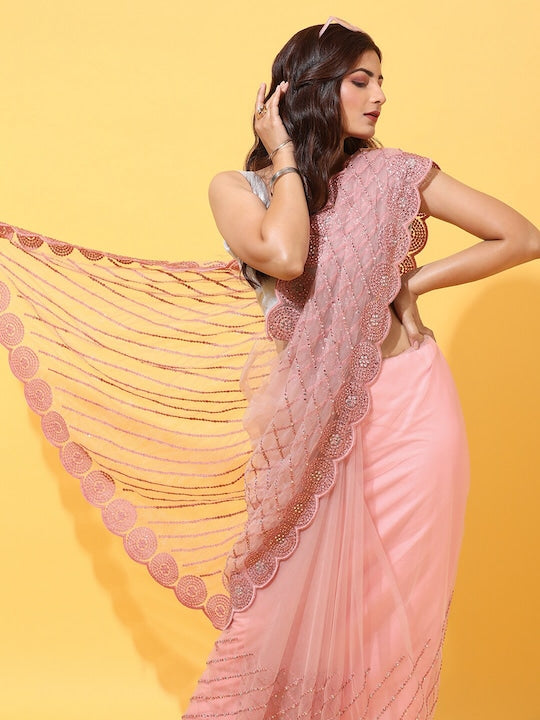 Kasee Pink Floral Beads and Stones Net Heavy Work Saree