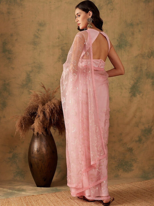 Sangria Pink Floral Embroidered Sequinned Net Saree